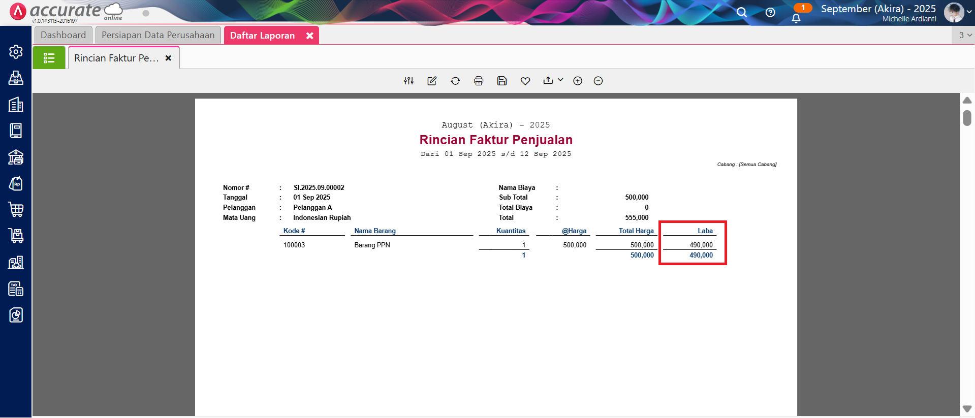 - Sehingga pada laporan Rincian Faktur Penjualan yang sudah dilakukan modifikasi ini akan menampilkan informasi nilai laba per faktur.