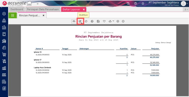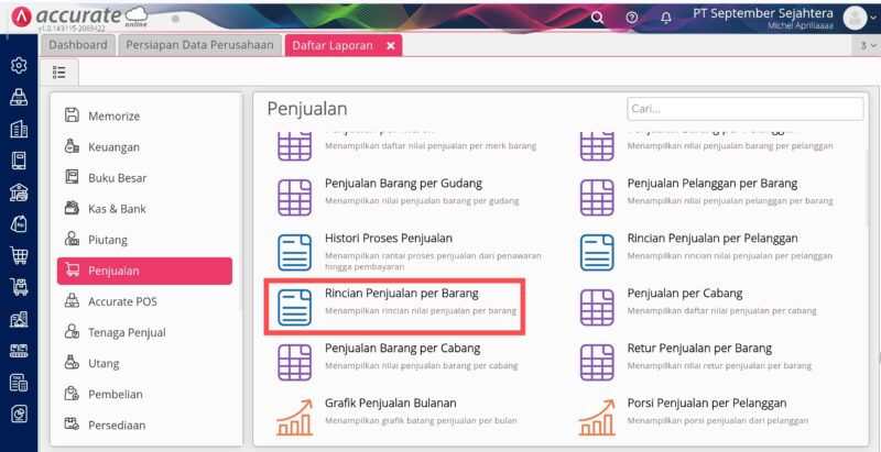 Laporan Rincian Penjualan per Barang di Daftar Laporan Penjualan