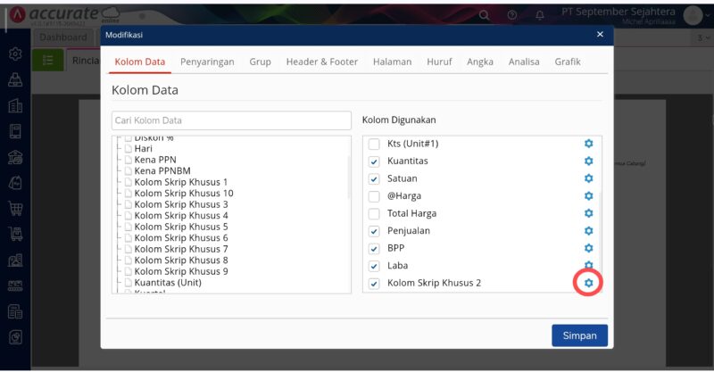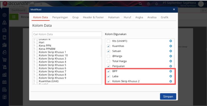 - Klik Modifikasi, pada Kolom Data cari dan klik 2x variable BPP, Laba, dan Kolom Skrip Khusus 2 hingga tampil di Kolom Digunakan.