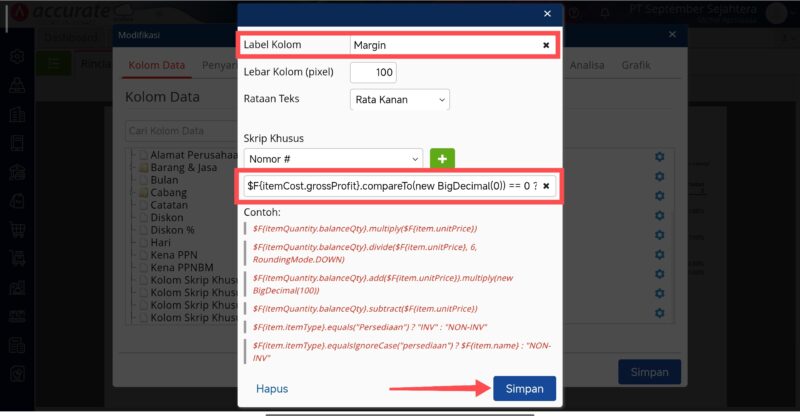 - Klik tombol Pengaturan pada Kolom Skrip Khusus 2, lalu ganti Label Kolom dengan nama yang sesuai misalnya adalah Margin, kemudian masukan rumus skrip berikut ini : $F{itemCost.grossProfit}.compareTo(new BigDecimal(0)) == 0 ? 1 :$F{itemCost.grossProfit}.divide($F{salesDetail.salesAmountBase}, 2, RoundingMode.DOWN).multiply(new BigDecimal(100))+”%”