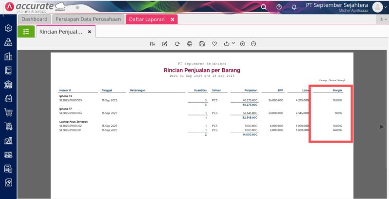 - Simpan hasil modifikasi dan akan tampil Laporan Rincian per Barang dengan informasi Margin Laba Kotor.