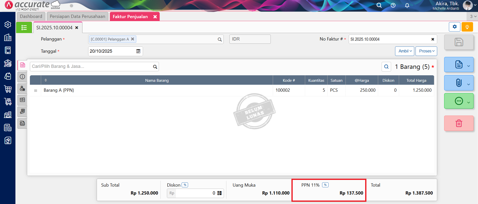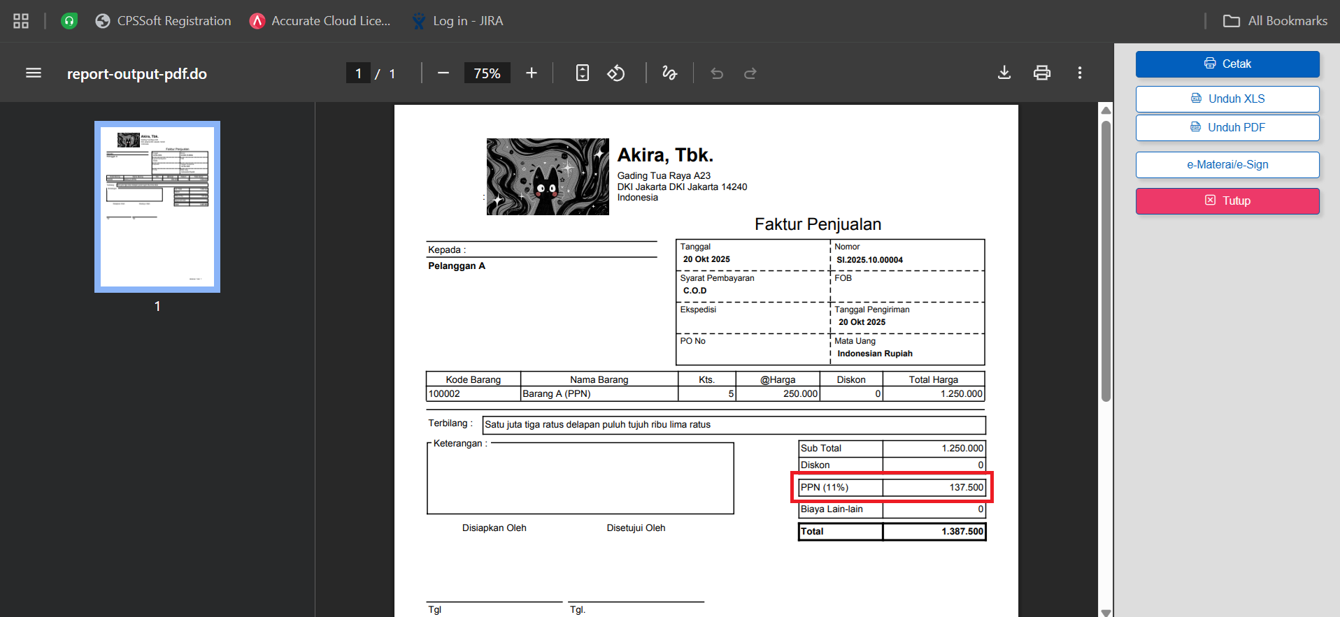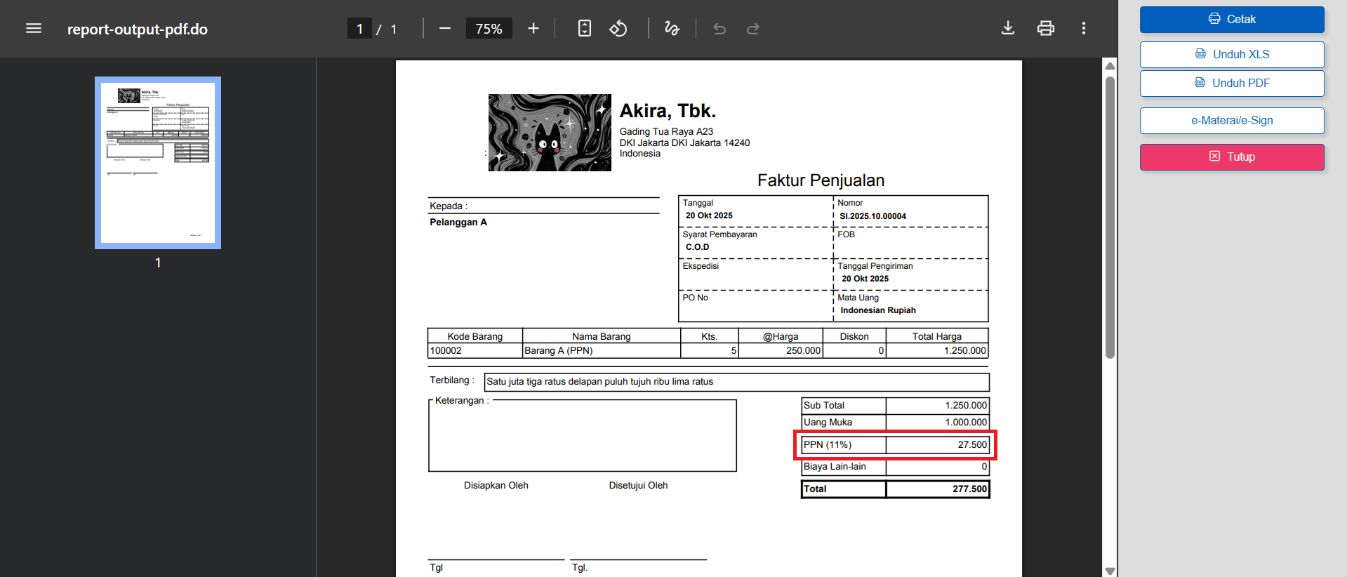 Contoh Kasus : Faktur Penjualan dengan nilai sebesar Rp 1.387.500 (termasuk PPN sebesar Rp 137.500) dengan uang muka sebesar Rp 1.110.000 (termasuk PPN sebesar Rp 110.000). Dan ingin menampilkan nilai PPN Setelah dikurangi PPN Uang Muka Penjualan di Desain Cetakan Faktur Penjualan yaitu sebesar Rp 27.500.