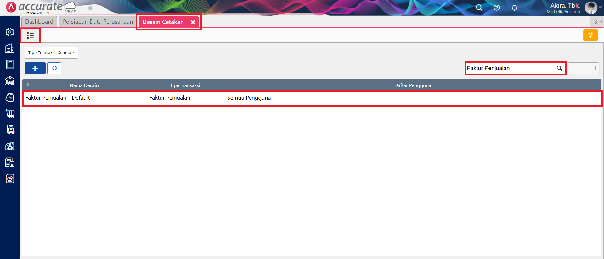 - Ke menu Pengaturan | Desain Cetakan, lalu klik tombol Daftar berwarna hijau di samping tab Data Baru, dan lakukan pencarian atas desain cetakan Faktur Penjualan yang dimaksud.