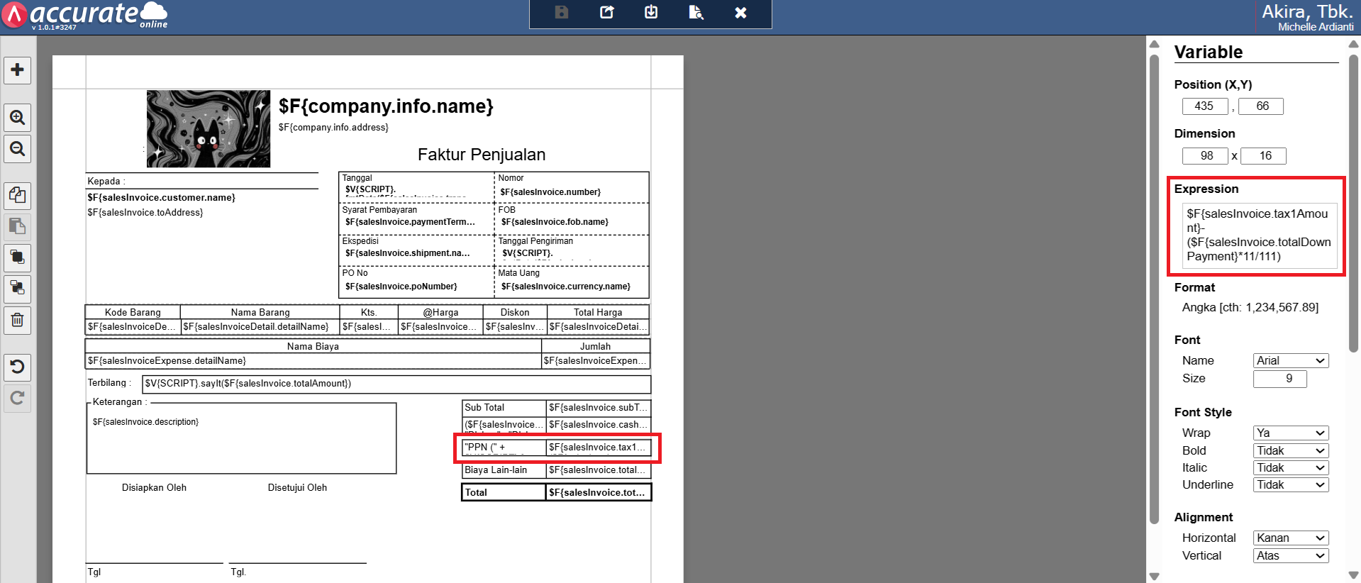 - Pada Desainer, klik 2x pada variable PPN nya atau isikan pada Kotak Expression, ganti variable skrip nya dengan rumus berikut : $F{salesInvoice.tax1Amount}-($F{salesInvoice.totalDownPayment}*11/111).
