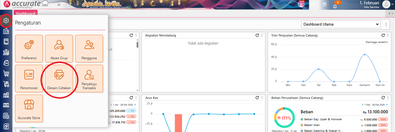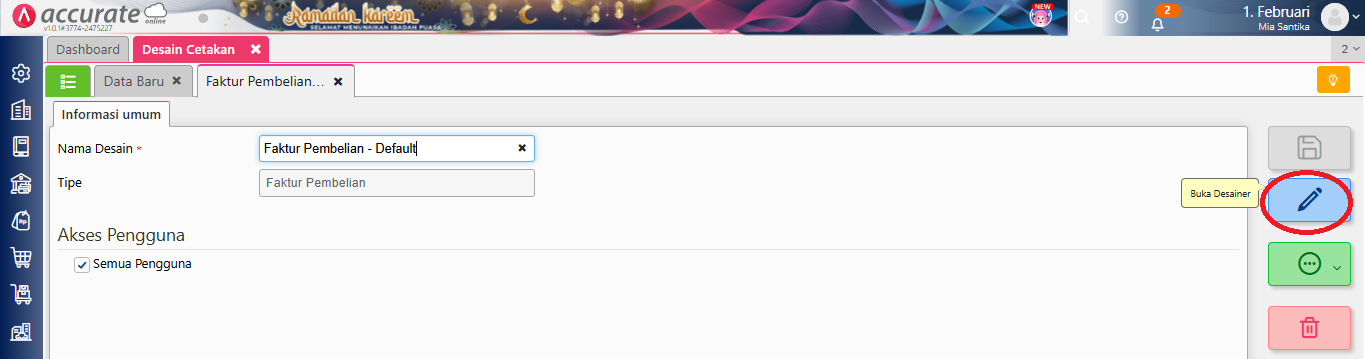 - Ke menu Pengaturan | Desain Cetakan, lalu klik tombol Daftar berwarna hijau di samping tab Data Baru, dan lakukan pencarian atas desain cetakan yang dimaksud (misal, Faktur Pembelian), lalu klik Buka Desainer.