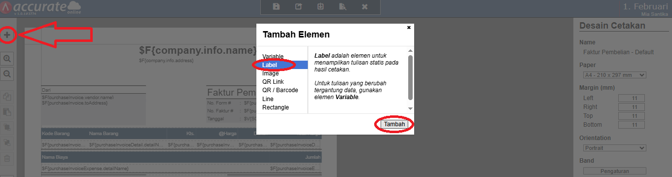 - Tambah Elemen Label dengan klik tombol Tambah Elemen (+), lalu pilih Label | Tambah. Posisikan kolom Label tersebut pada bagian footer, lalu isikan Nama Label di kolom Text (misal, Retur).