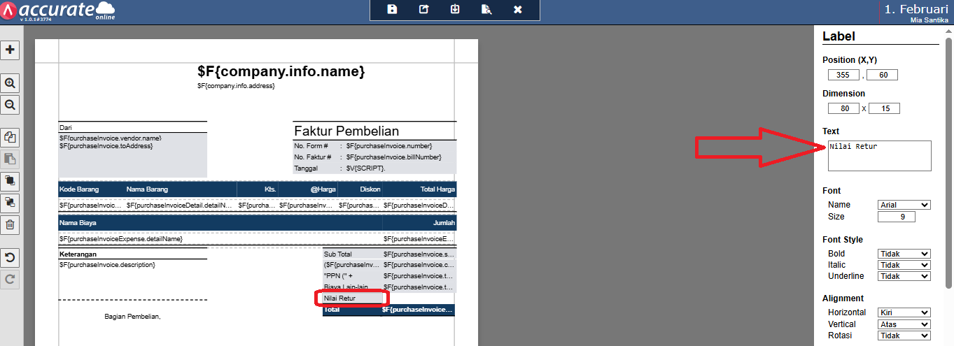 Berikut langkah-langkah untuk menampilkan nilai retur pembelian pada desain cetakan faktur pembelian: