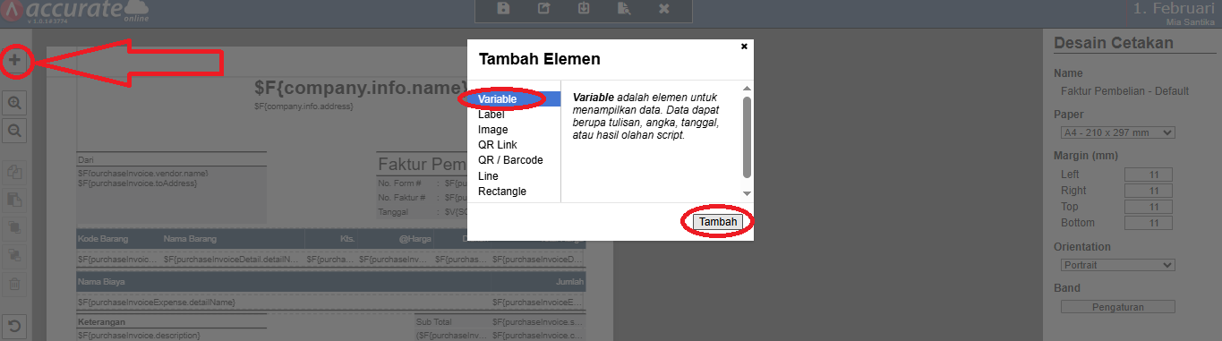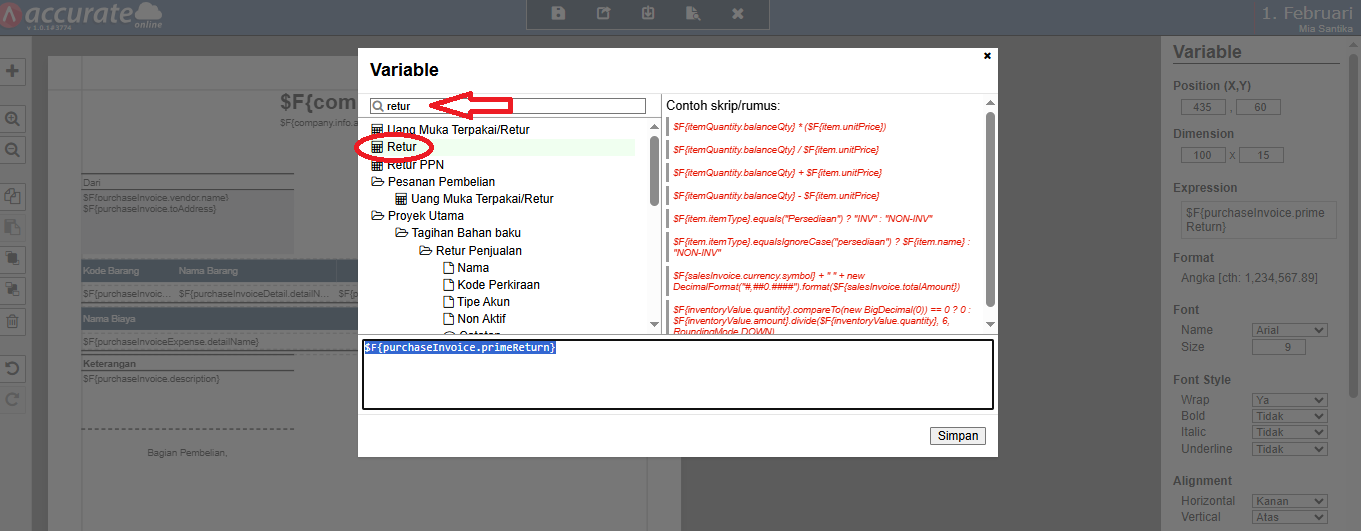 - Tambah Elemen Variable dengan klik tombol Tambah Elemen (+), lalu pilih Variable | Tambah. Letakkan di samping kolom Label Retur yang dibuatkan pada poin 2, dan inputkan script rumus berikut ini: $F{purchaseInvoice.primeReturn}