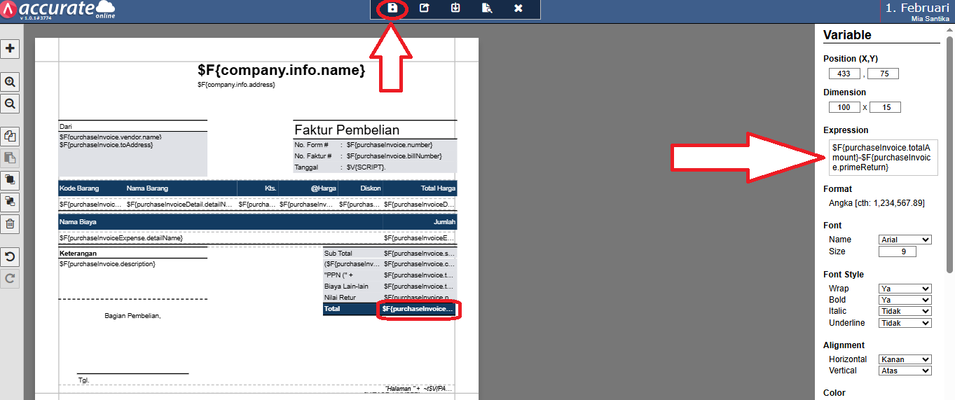 - Pada kolom Total, ubah rumusnya menjadi $F{purchaseInvoice.totalAmount}-$F{purchaseInvoice.primeReturn}, lalu klik Simpan.