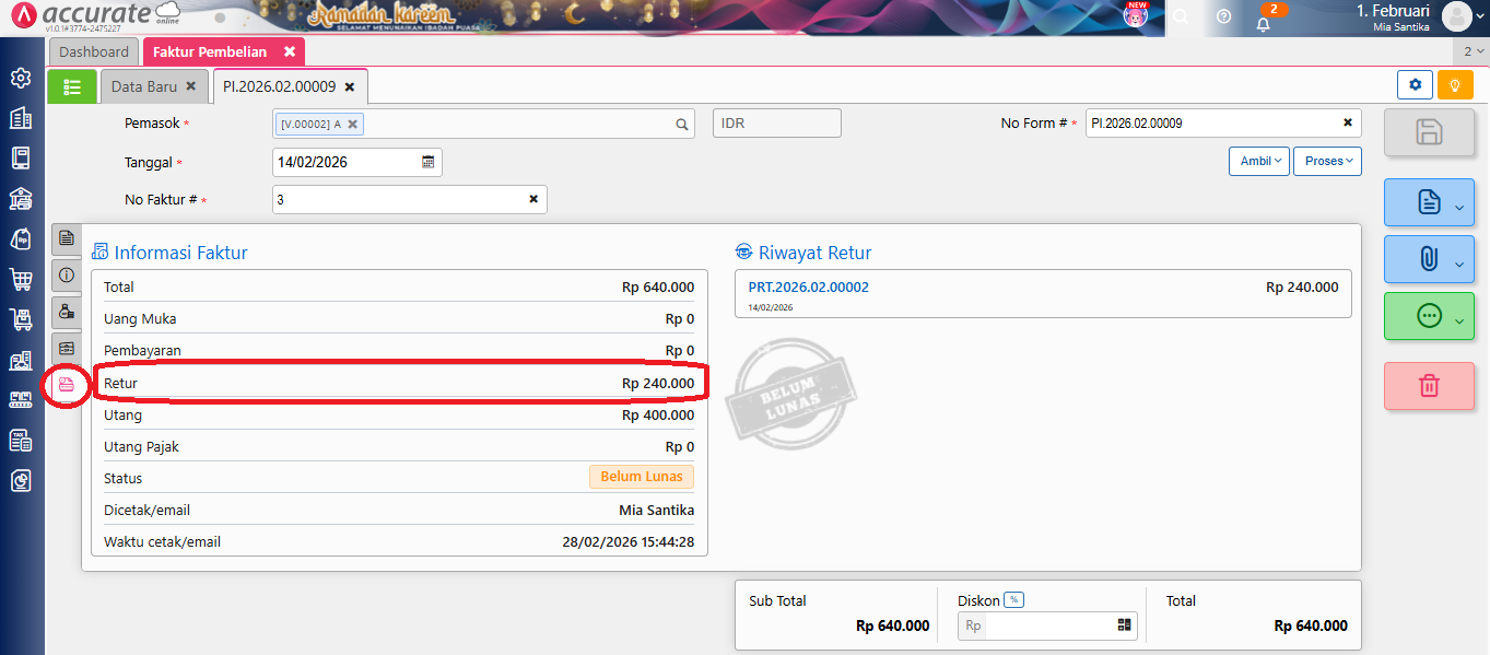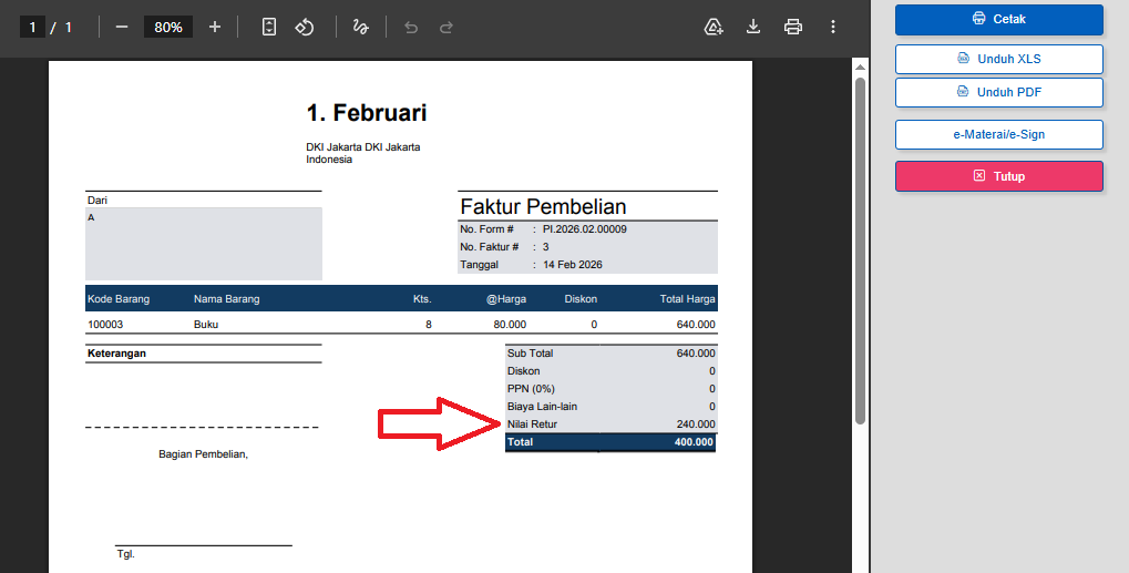 Tampilan Nilai Retur pada transaksi Faktur Pembelian