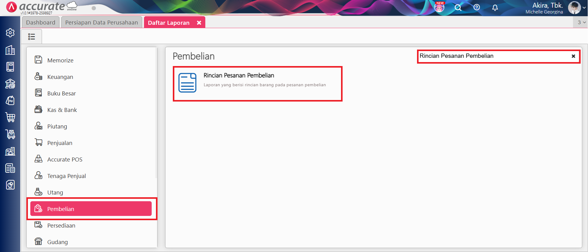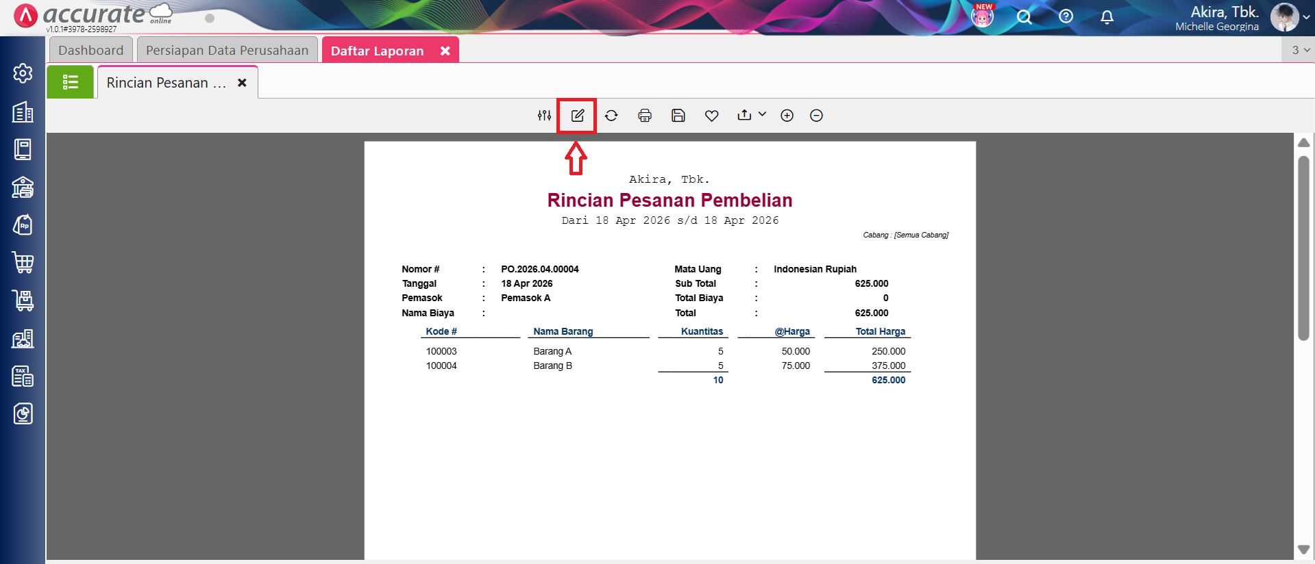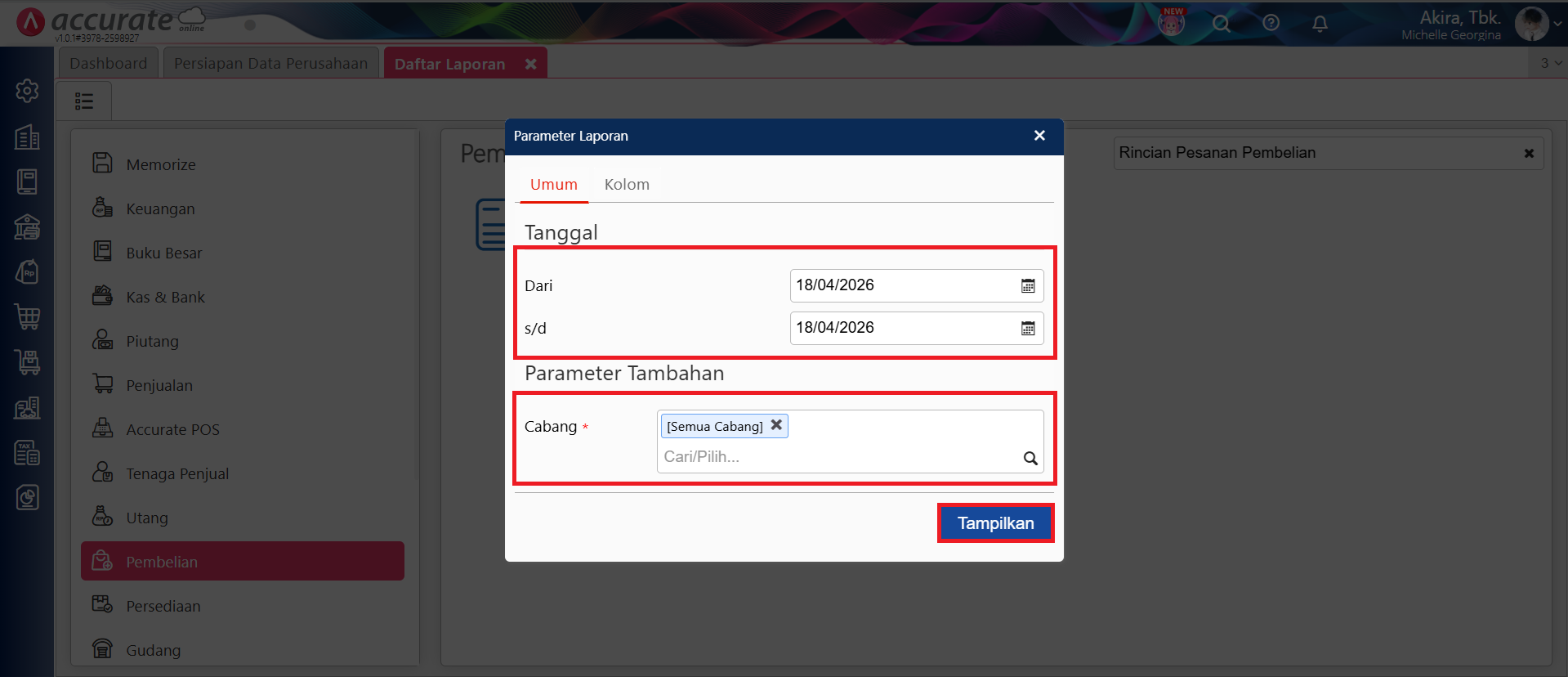 - Pilih Laporan yang ingin dimodifikasi, yaitu laporan Rincian Pesanan Pembelian. Lalu, atur parameter laporan seperti Tanggal dan Cabang sesuai kebutuhan, lalu klik Tampilkan.