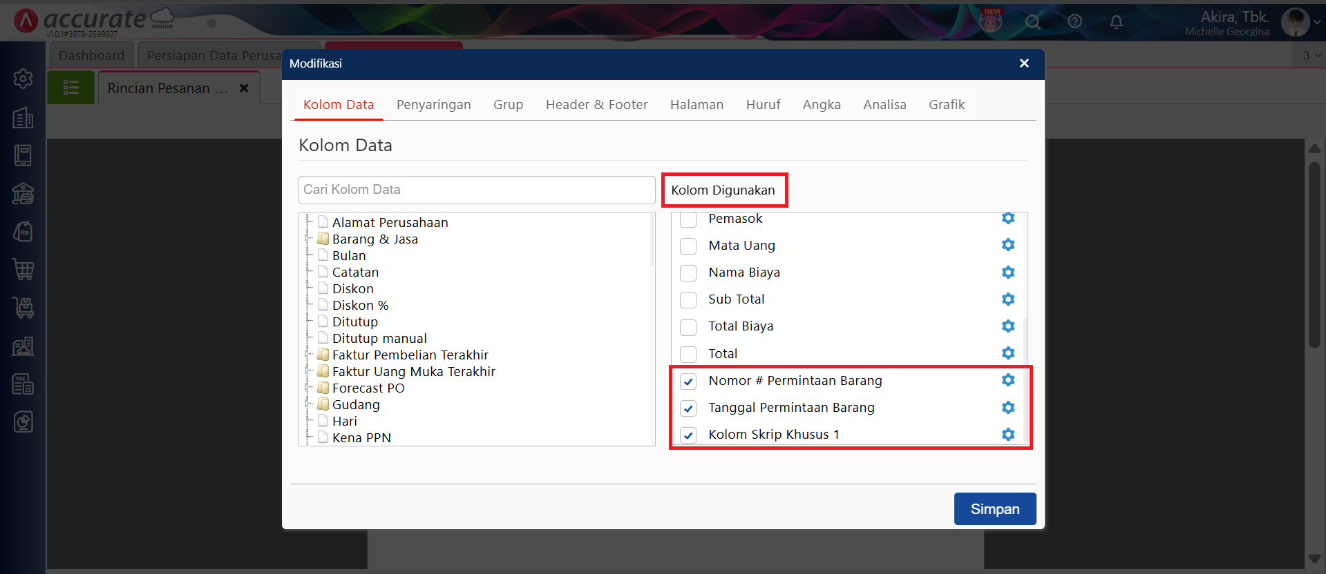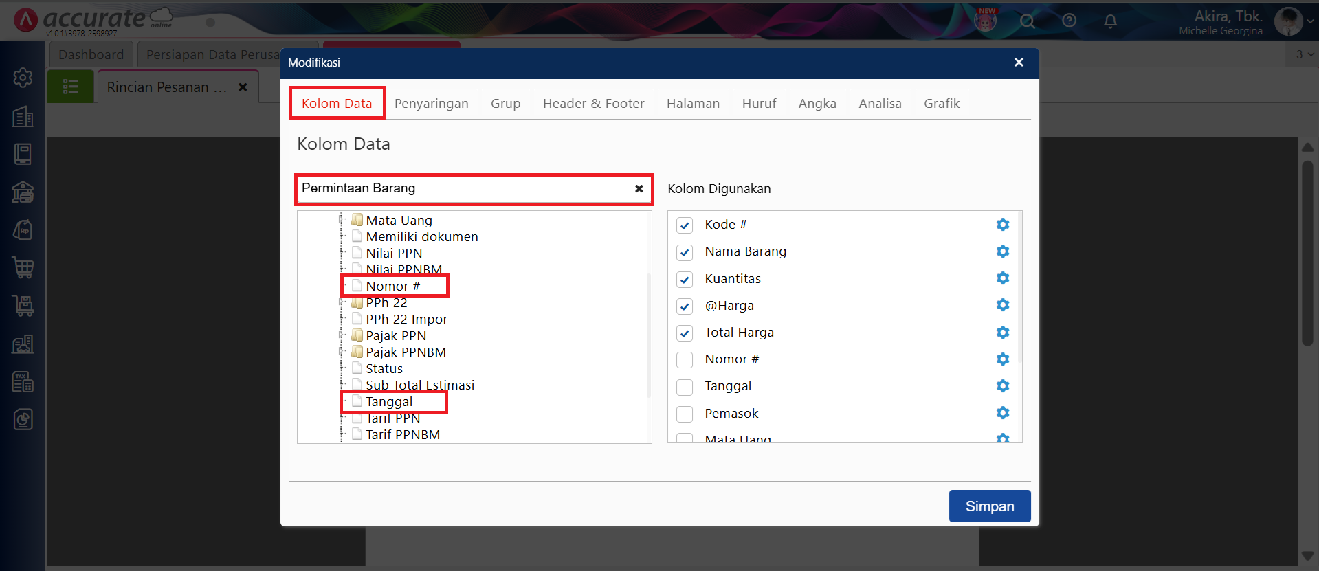 - Pada tab Kolom Data, cari dan tambahkan variable Nomor # dan Tanggal pada folder Permintaan Barang.
