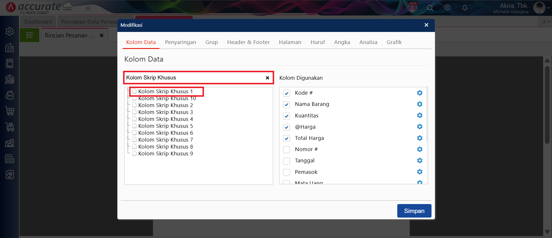 - Kemudian, cari dan tambahkan variable Kolom Skrip Khusus 1, dan klik dua kali variable hingga tampil pada Kolom Digunakan.