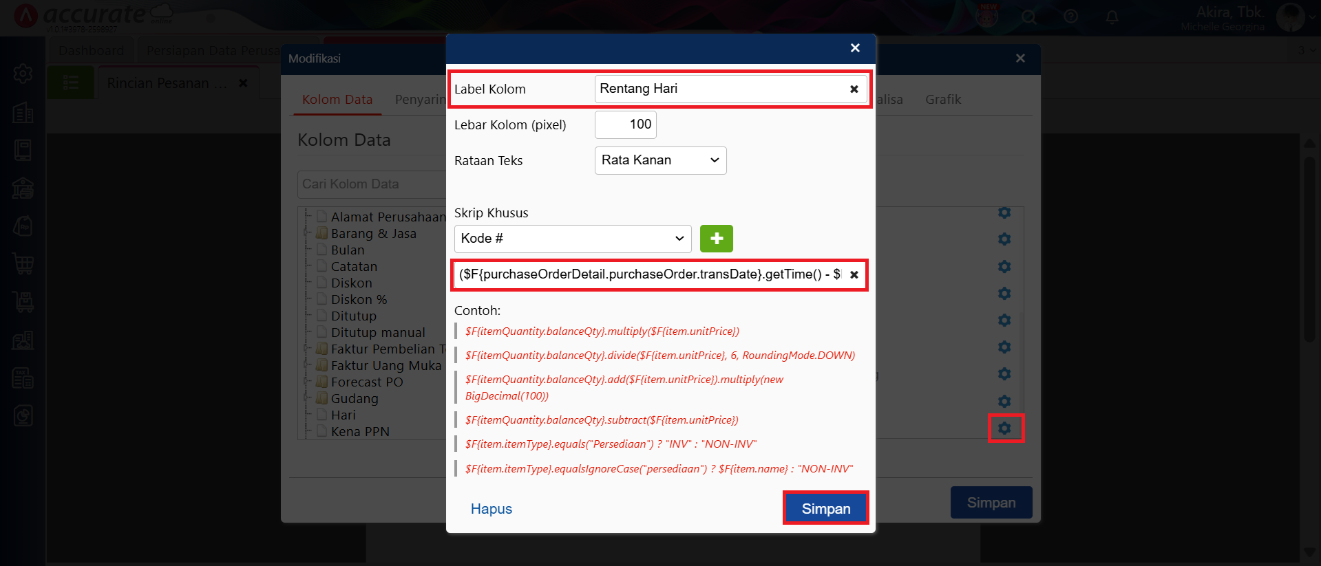 - Pada Kolom Skrip Khusus 1, digunakan untuk menampilkan Rentang Hari transaksi Pesanan Pembelian dengan Permintaan Barang, silahkan isikan dengan skrip rumus: