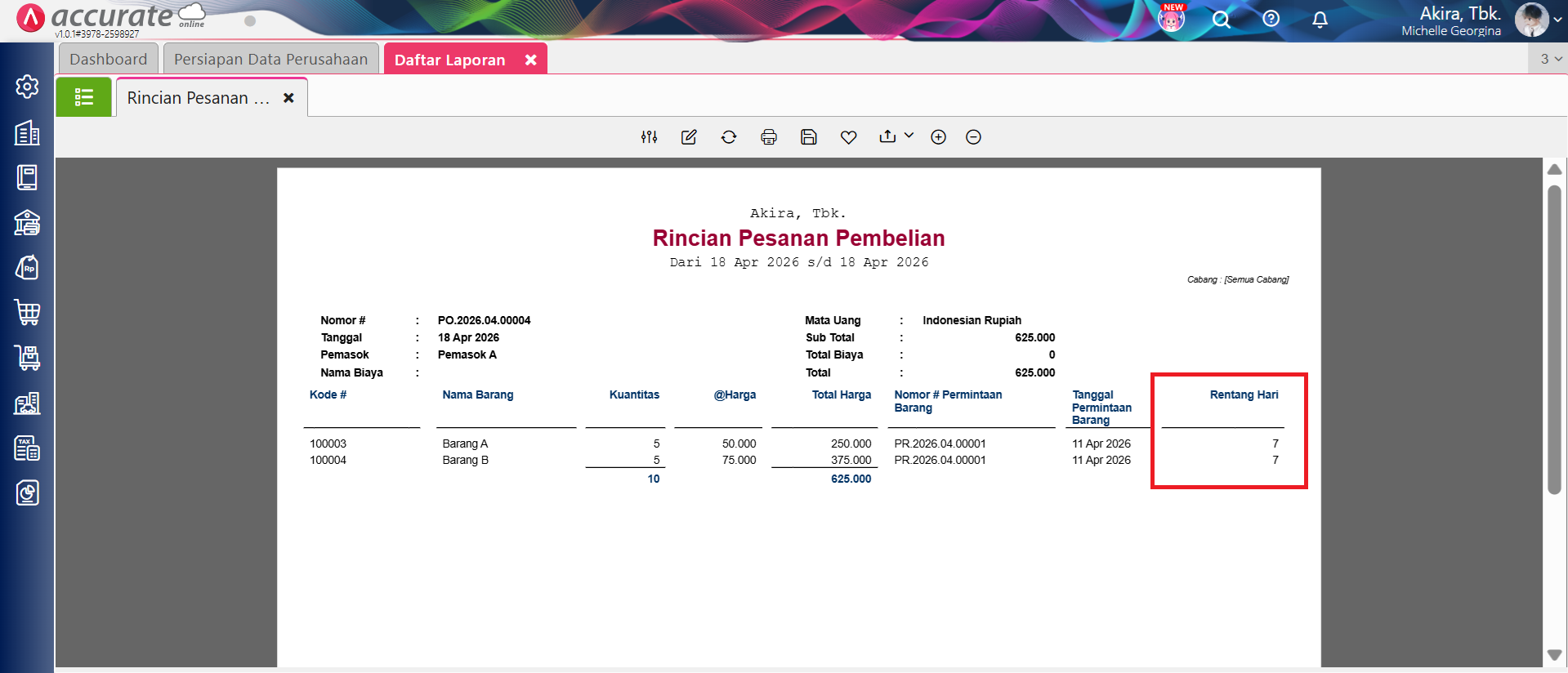 - Dan berikut tampilan laporan Rincian Pesanan Pembelian yang menampilkan Rentang Hari transaksi Pesanan Pembelian dengan Permintaan Barang.