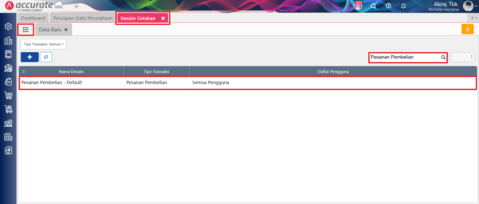 - Ke menu Pengaturan | Desain Cetakan, lalu klik tombol Daftar berwarna hijau di samping tab Data Baru, dan lakukan pencarian atas desain cetakan Pesanan Pembelian yang dimaksud.