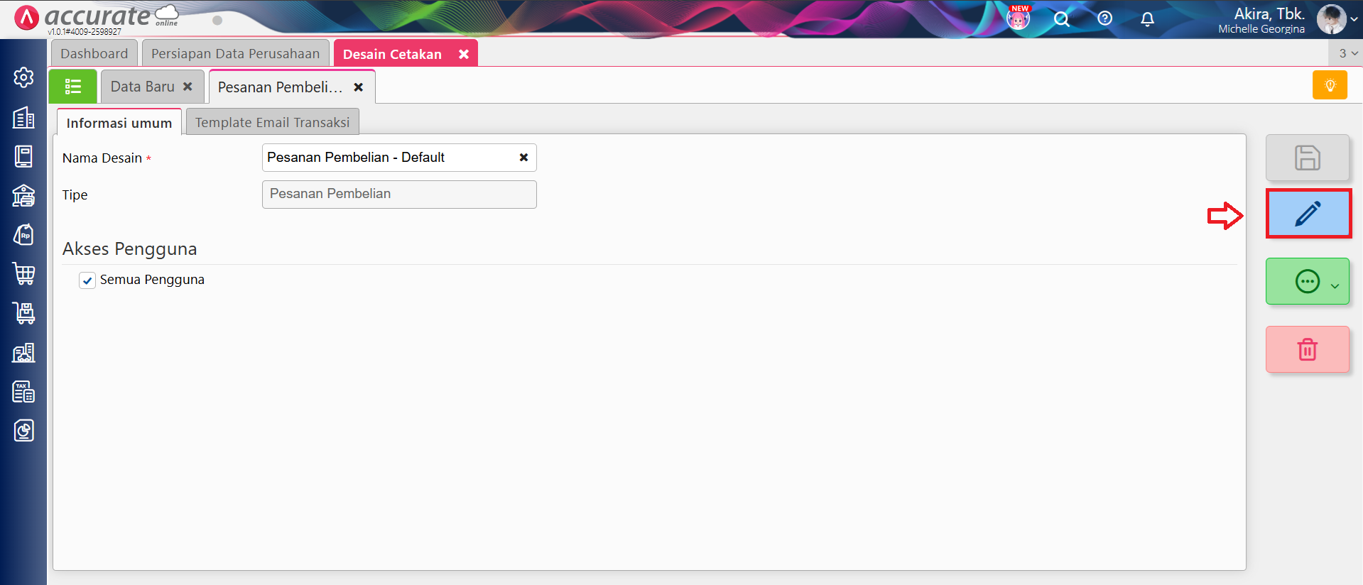- Pilih desain cetakan tersebut, dan klik tombol Buka Desainer (icon Pensil).