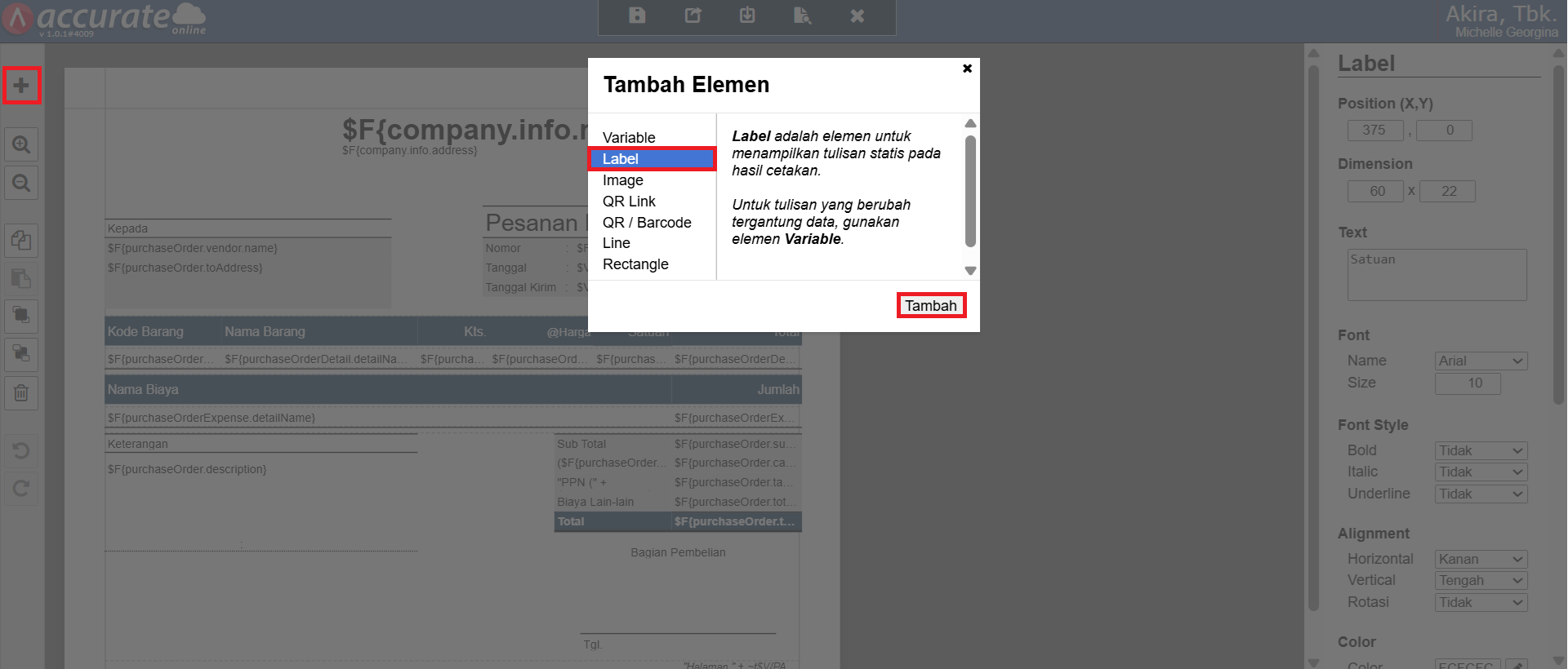 - Selanjutnya, klik tombol Tambah Element (icon +) | Label, klik Tambah dan posisikan kolom Label tersebut pada bagian Detail Item, berikan nama (misal, Satuan).