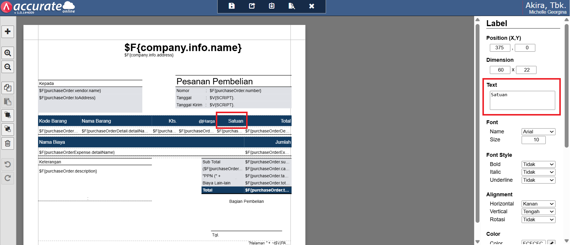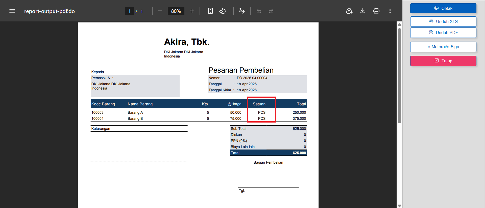 Berikut langkah-langkah untuk menampilkan satuan barang pada desain cetakan Pesanan Pembelian: