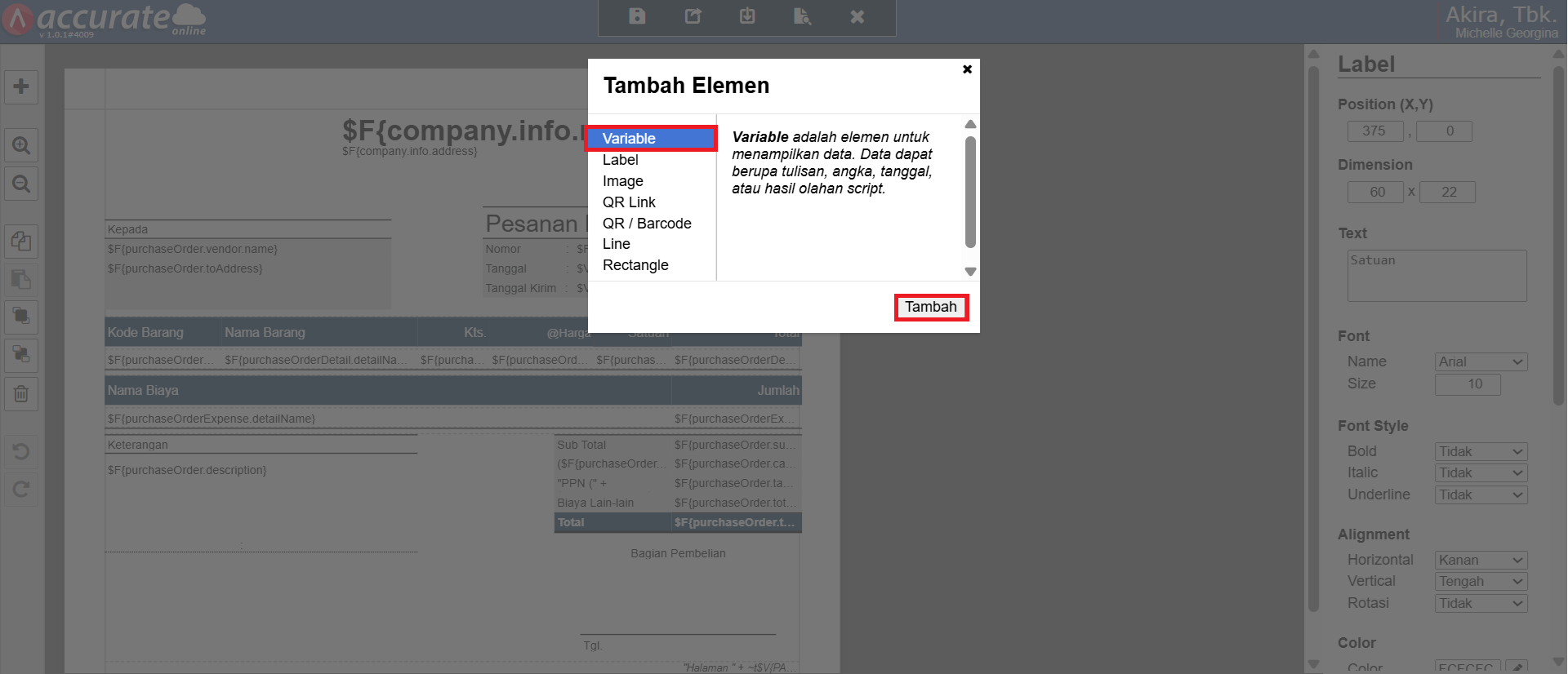 - Klik kembali tombol Tambah Element (icon +) | Variable, klik Tambah dan posisikan kolom Variable tersebut pada bagian Detail Item.