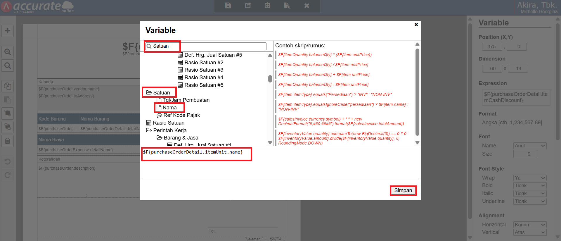 - Klik dua kali kolom variable yang sudah ditambahkan sebelumnya, dan lakukan pencarian atas variable Satuan pada kolom pencarian. Klik variable Satuan hingga tampil informasi $F{purchaseOrderDetail.itemUnit.name} dan klik Simpan.