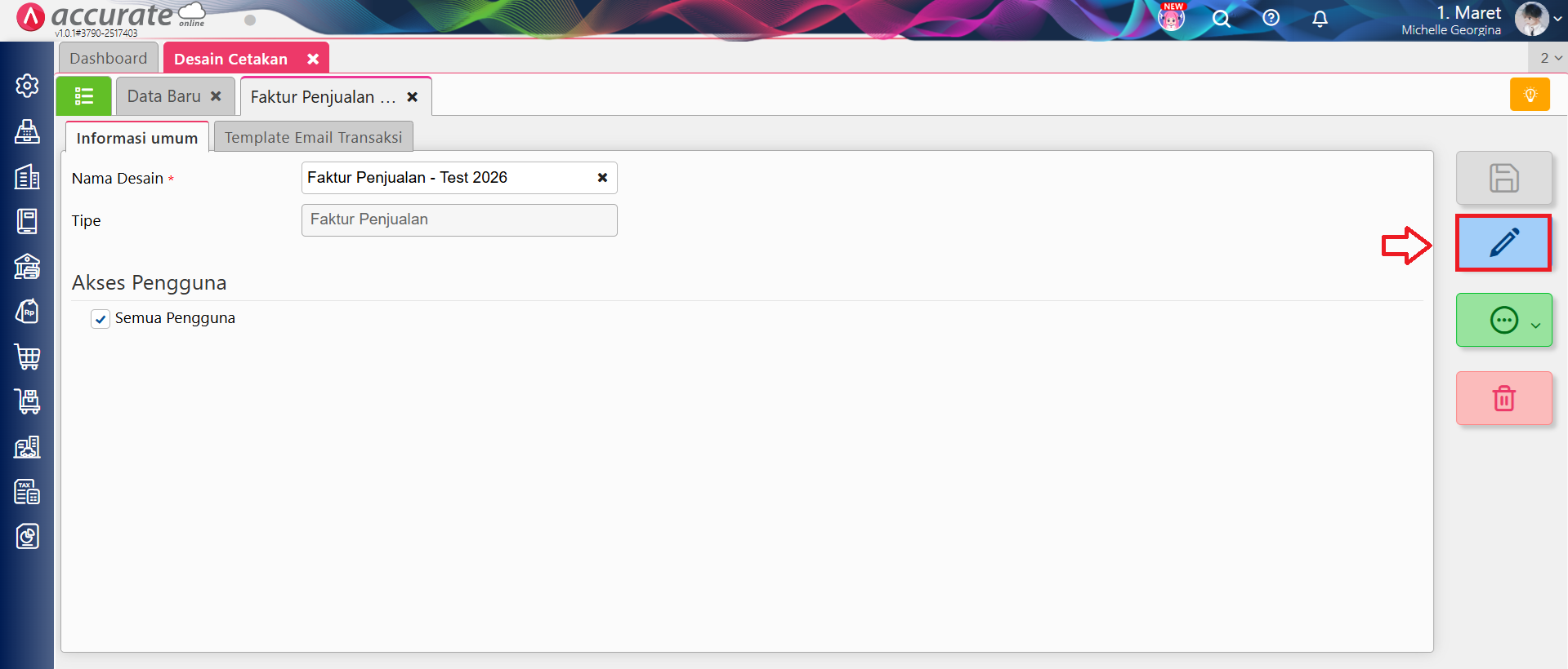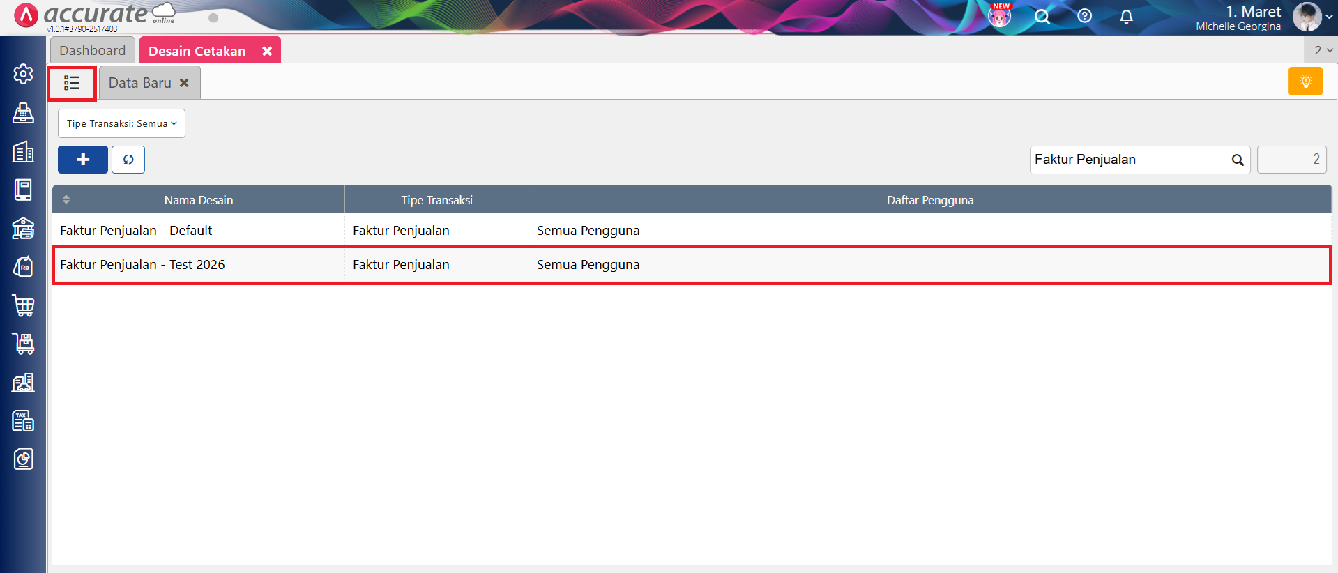 - Ke menu Pengaturan | Desain Cetakan, lalu klik tombol Daftar berwarna hijau di samping tab Data Baru, dan lakukan pencarian atas desain cetakan faktur penjualan yang dimaksud, lalu klik Buka Desainer.