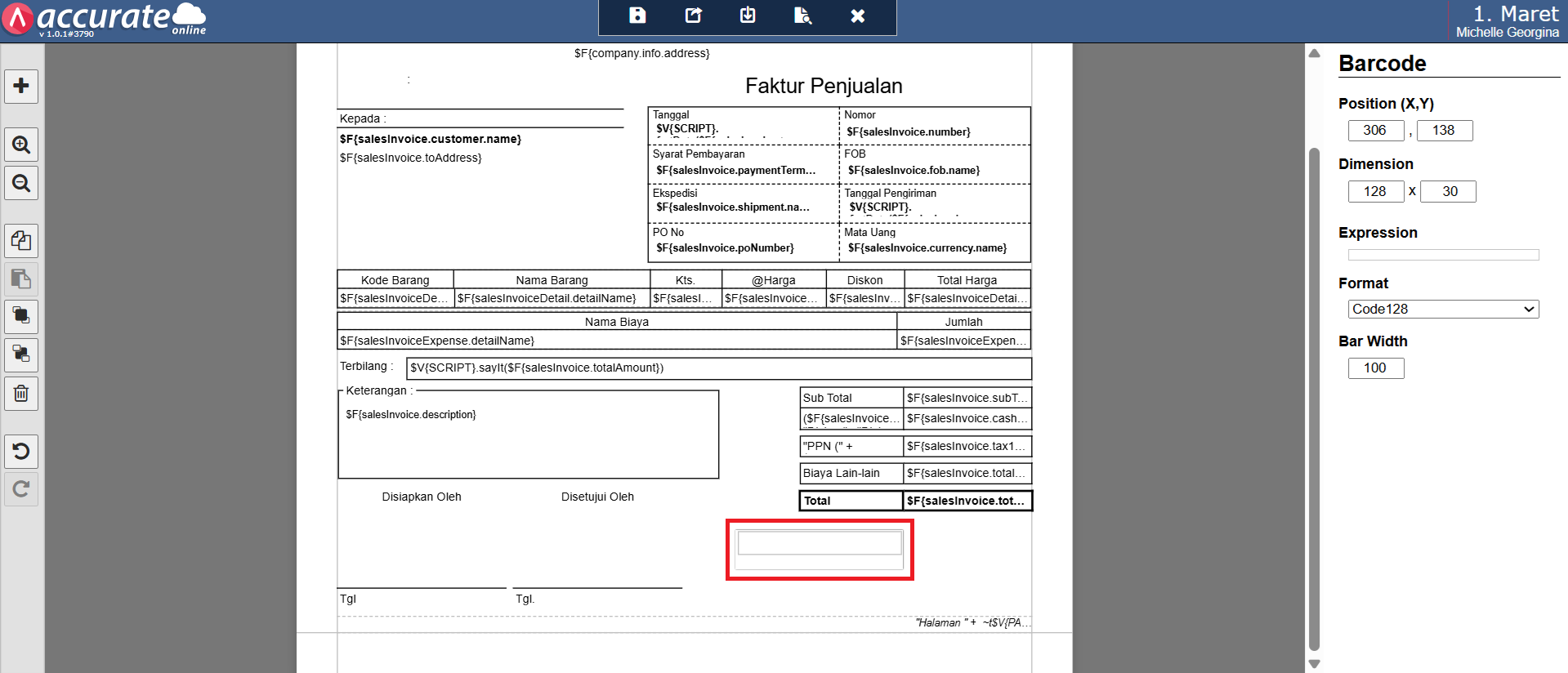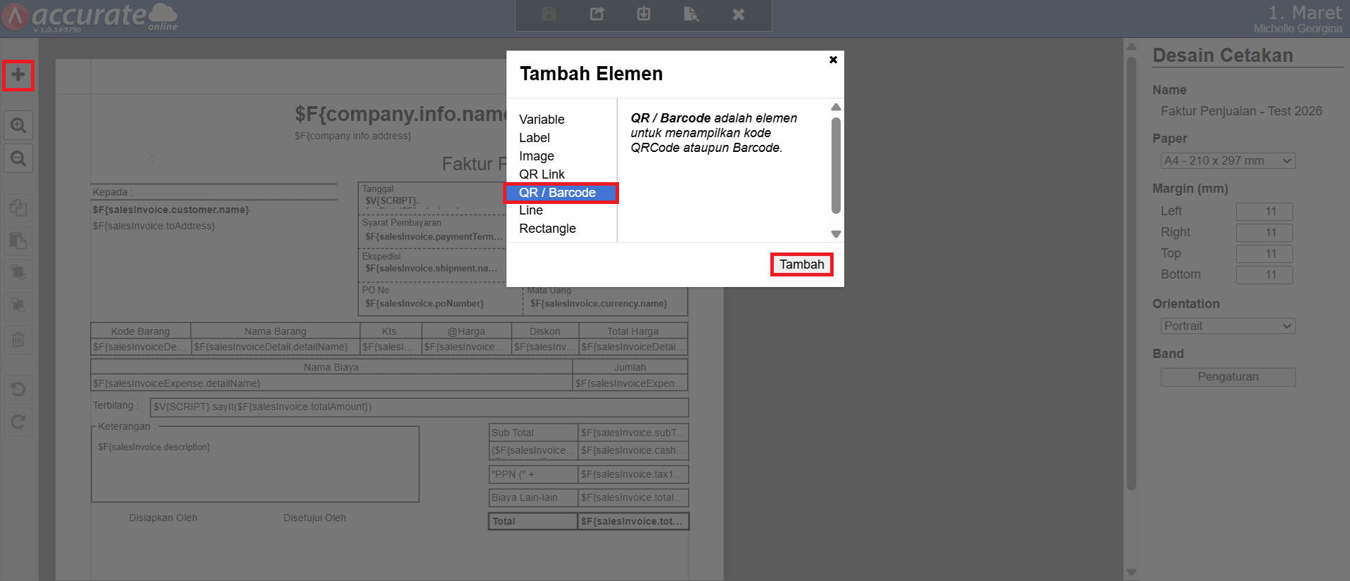 - Tambah Elemen QR/Barcode dengan klik tombol Tambah Elemen (+), lalu pilih QR/Barcode | Tambah, dan posisikan kolom tersebut sesuai dengan kebutuhan.