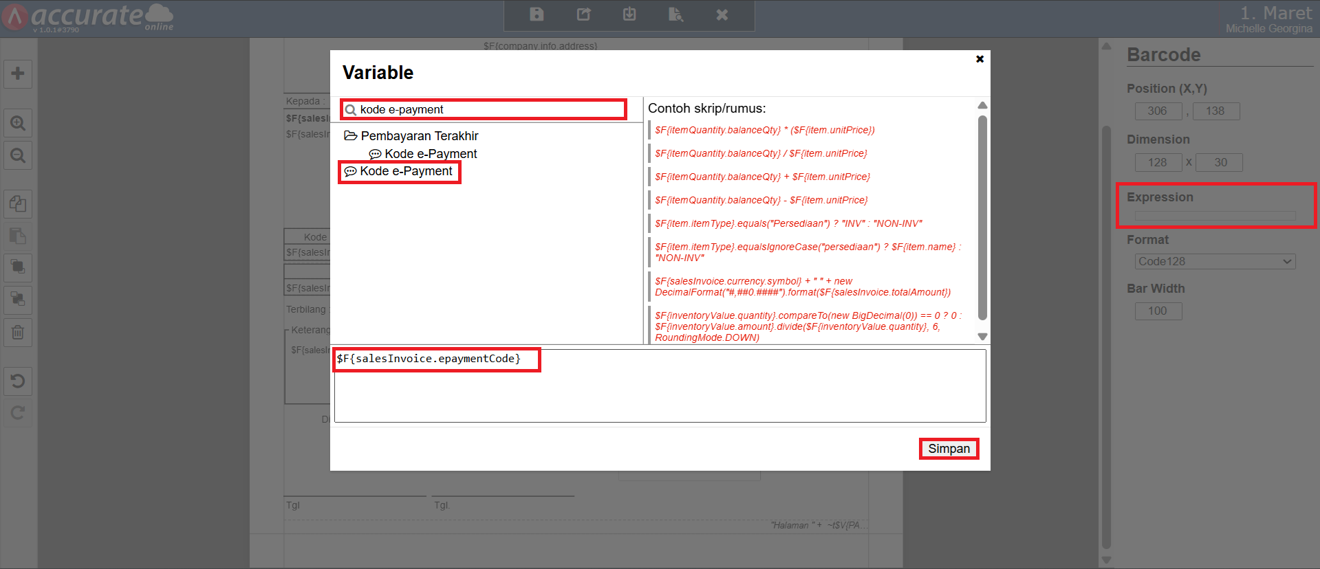 - Pada bagian Expression, cari variable “Kode e-Payment” dan klik variable tersebut, lalu klik Simpan.