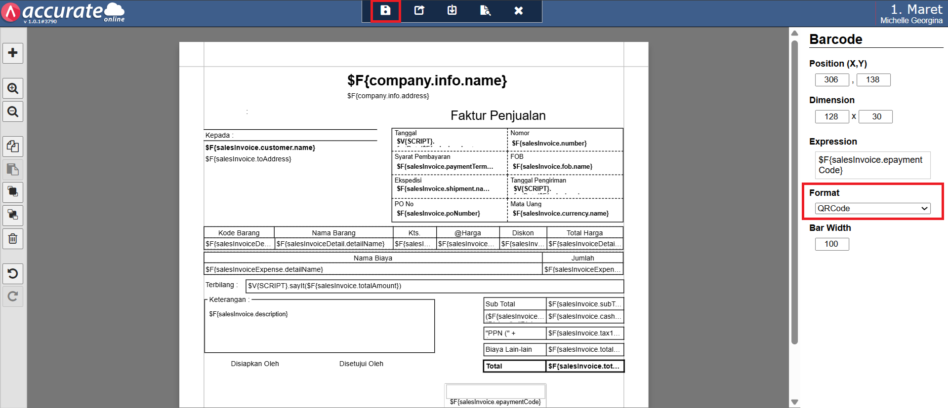 - Selanjutnya, pada bagian Format ubah menjadi QRCode, lalu klik Simpan untuk menyimpan desain cetakan nya.