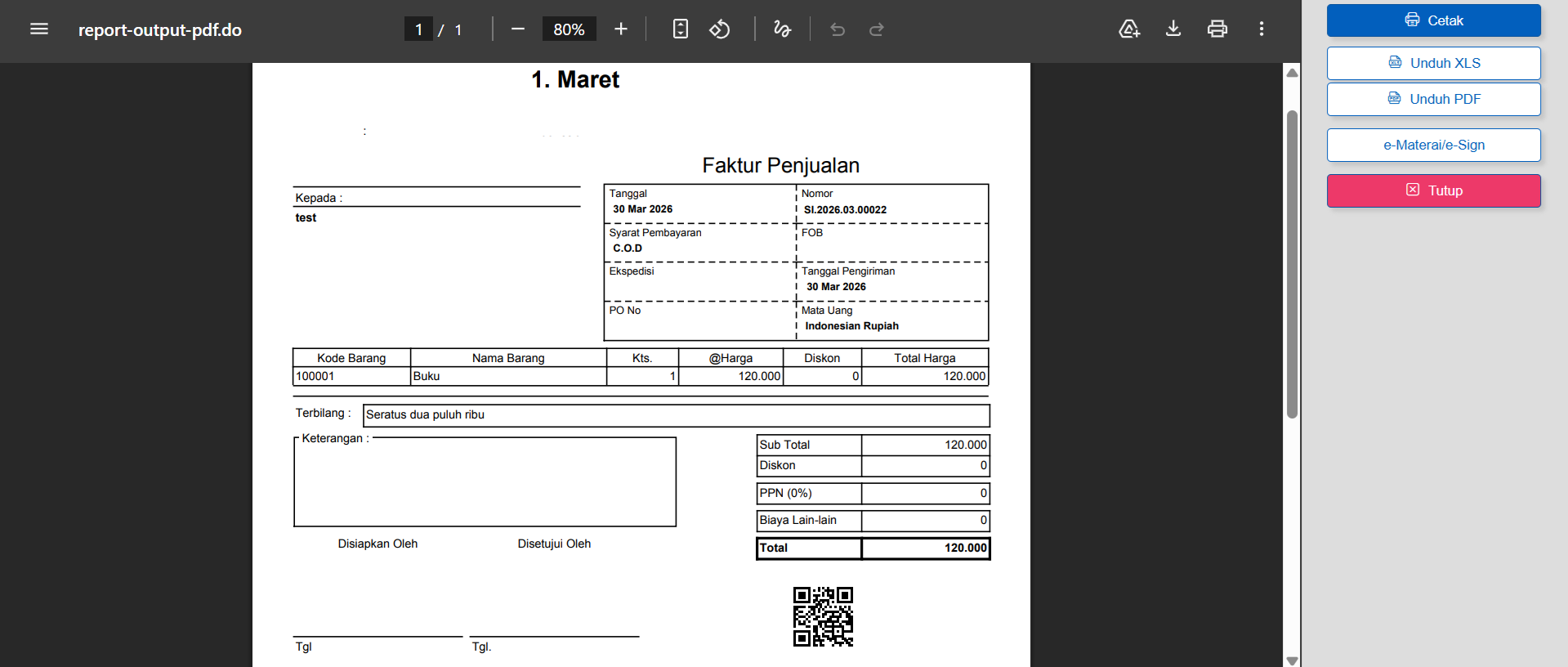 - Berikut tampilan saat cetak transaksi Faktur Penjualan dengan QRCode.