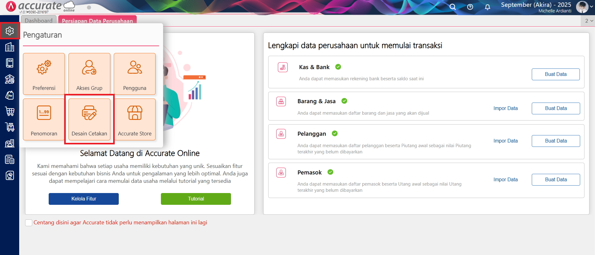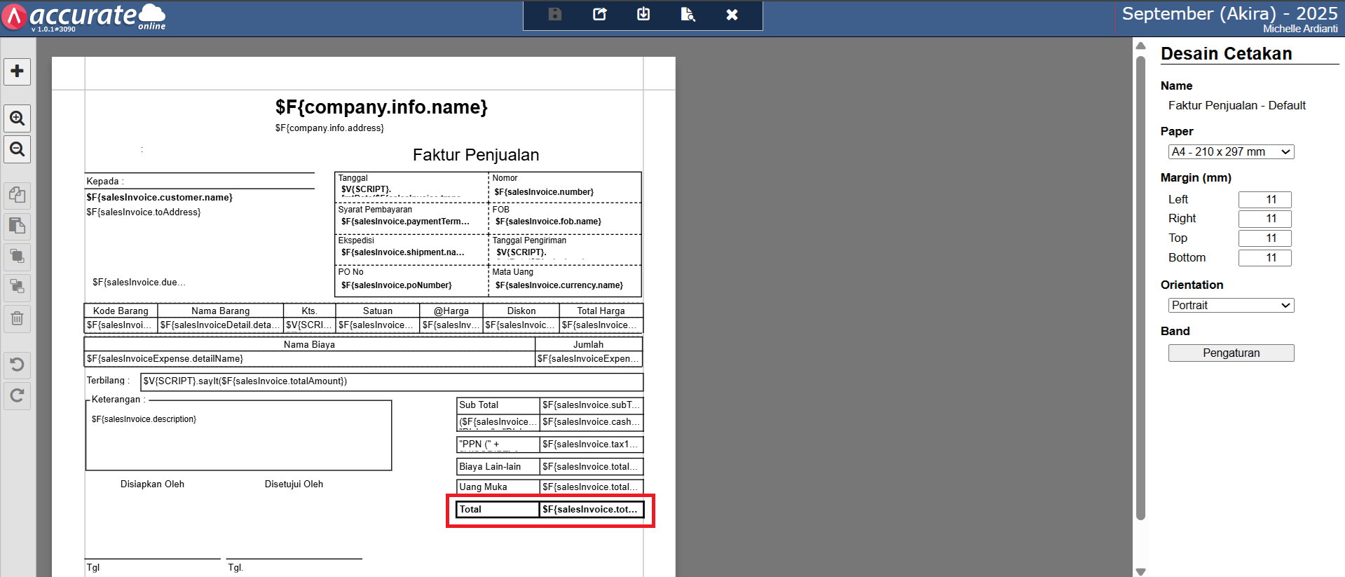 Desain Cetakan default dari ACCURATE tidak menampilkan simbol mata uang. Namun jika ingin menampilkan simbol mata uang, dapat dilakukan dengan cara menambahkan variabel simbol pada desain cetakan.