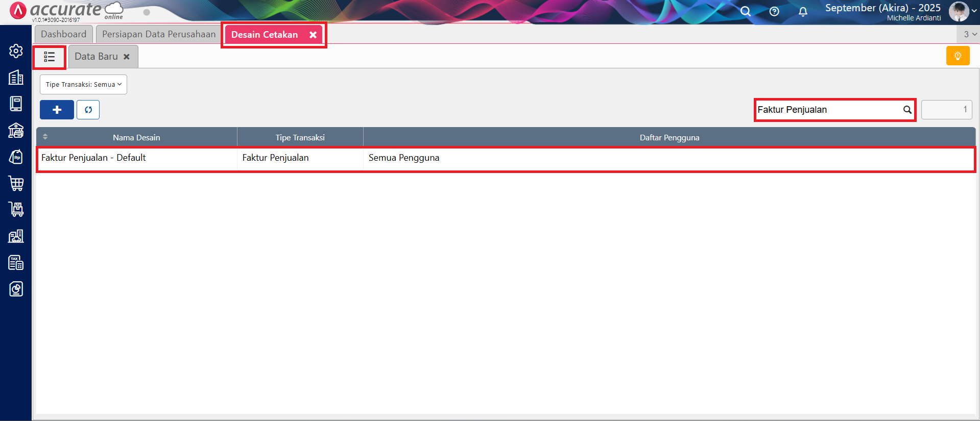1. Ke menu Pengaturan | Desain Cetakan, lalu klik tombol Daftar berwarna hijau di samping tab Data Baru, dan lakukan pencarian atas desain cetakan Faktur Penjualan yang dimaksud.