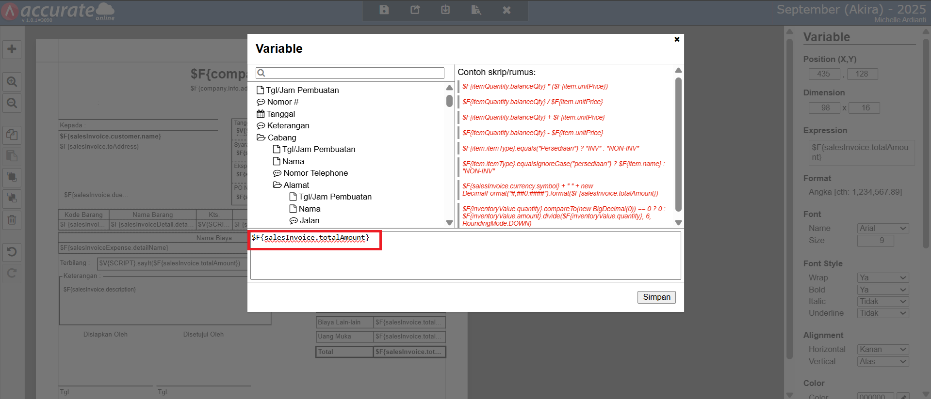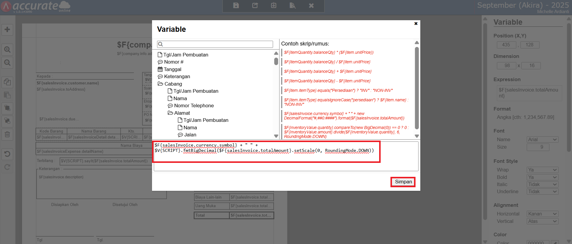4. Tambahkan 2 Skrip berikut ini pada variable Total, yaitu (a) tambahkan skrip  $F{salesInvoice.currency.symbol} + ” ” + pada bagian depan, dan (b) tambahkan skrip .setScale(0, RoundingMode.DOWN) pada bagian belakang. Sehingga skrip pada variable total menjadi :$F{salesInvoice.currency.symbol} + ” ” + $V{SCRIPT}.fmtBigDecimal($F{salesInvoice.totalAmount}.setScale(0, RoundingMode.DOWN))
