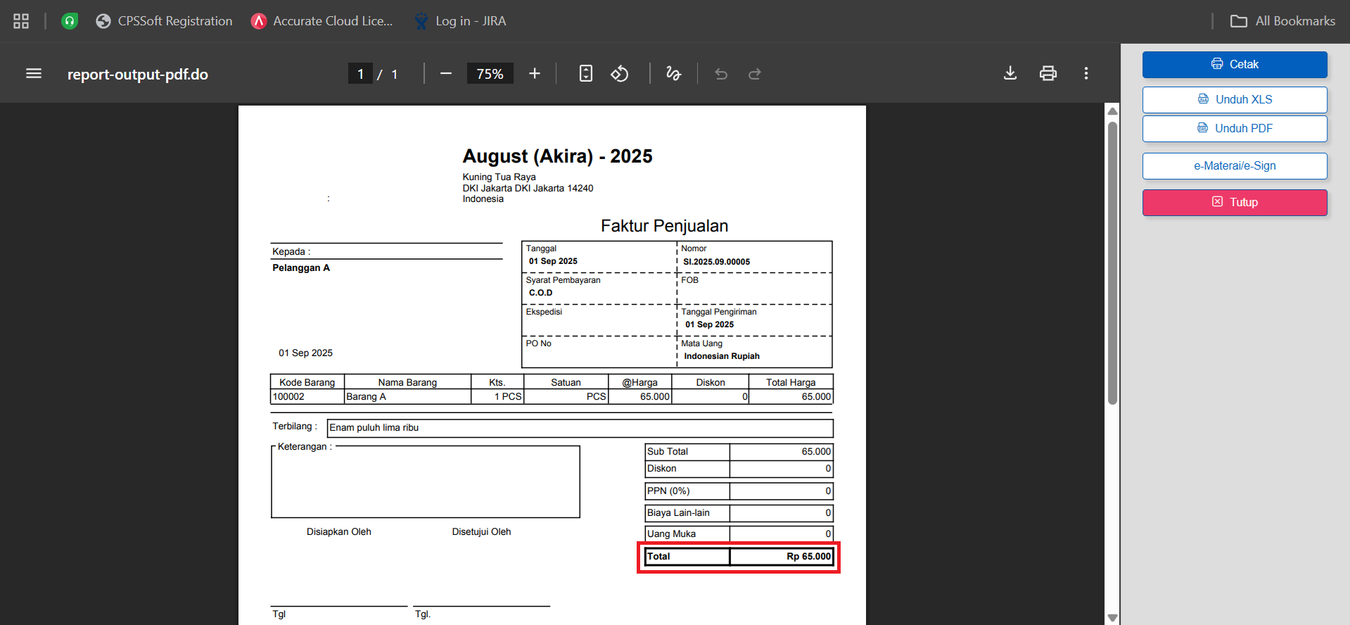 5. Simpan desain cetakan tersebut, dan berikut tampilan hasil cetak transaksi yang telah ditambahkan skrip simbol mata uang.