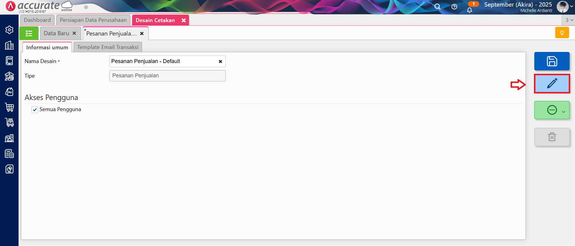 1. Ke menu Pengaturan | Desain Cetakan, lalu klik tombol Daftar berwarna hijau di samping tab Data Baru, dan lakukan pencarian atas desain cetakan Pesanan Penjualan yang dimaksud.