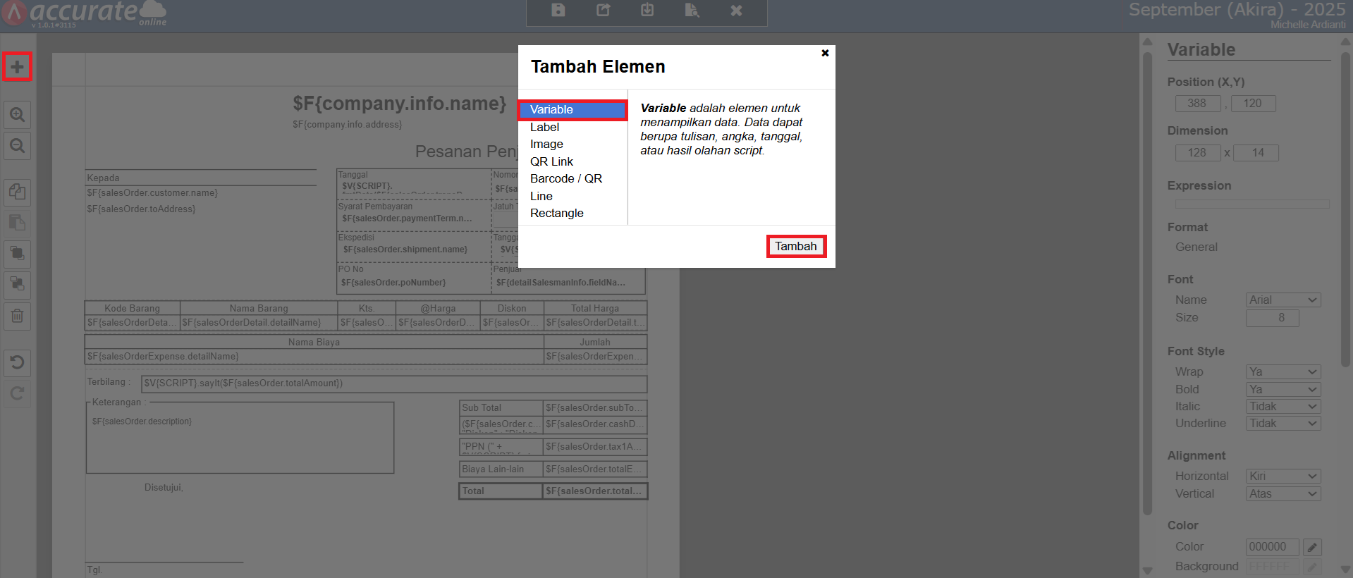 3. Klik tombol Tambah Element (icon +) | Variable, klik Tambah dan posisikan kolom Variable tersebut sesuai dengan yang diinginkan.