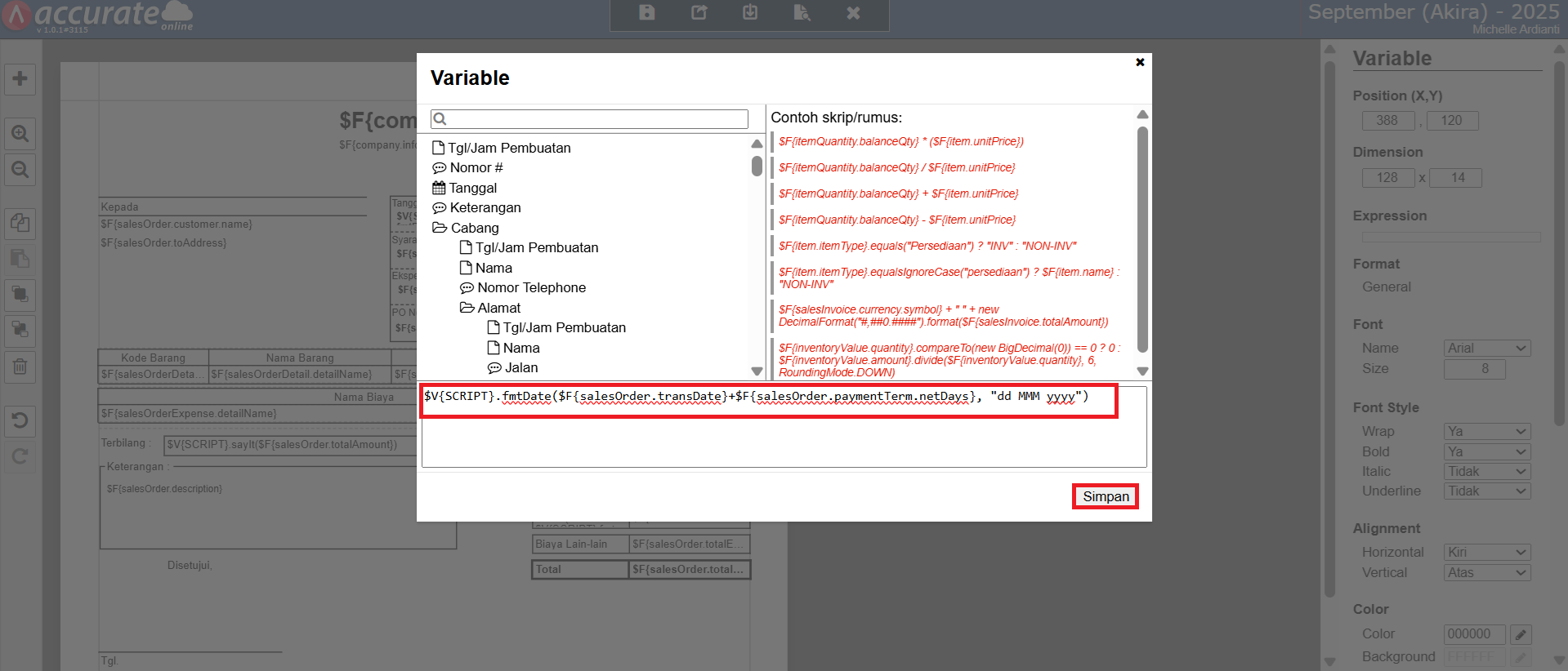 4. Klik dua kali kolom variable yang sudah ditambahkan sebelumnya, dan lakukan penginputan skrip rumus berikut ini, lalu klik Simpan. $V{SCRIPT}.fmtDate($F{salesOrder.transDate}+$F{salesOrder.paymentTerm.netDays}, “dd MMM yyyy”)