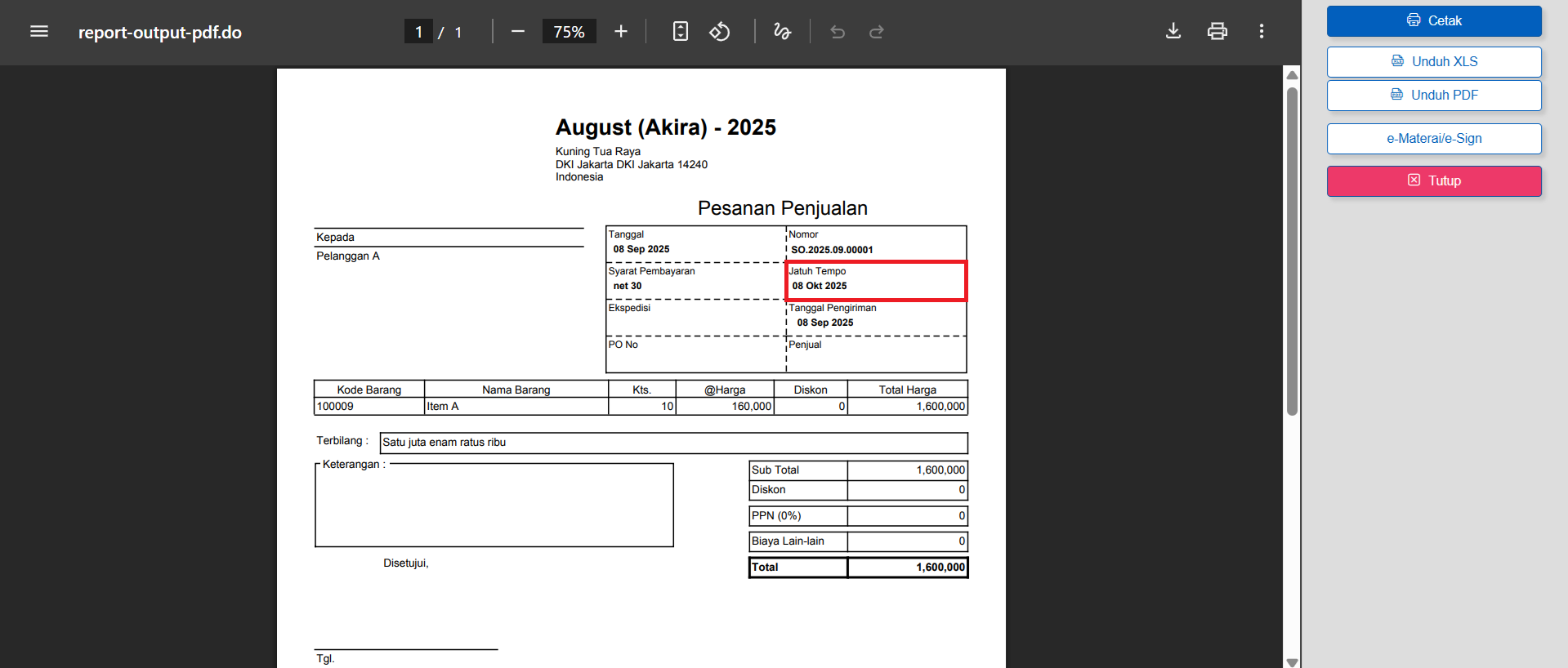 Ilustrasi : Transaksi Pesanan Penjualan per tanggal 08 September 2025 dengan Syarat Pembayaran Net 30, ingin menampilkan tanggal jatuh tempo-nya pada desain cetakan Pesanan Penjualan. Tanggal jatuh tempo berdasarkan syarat pembayaran dari tanggal Pesanan Penjualan-nya yaitu tanggal 08 Oktober 2025.