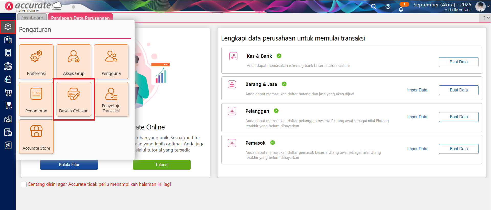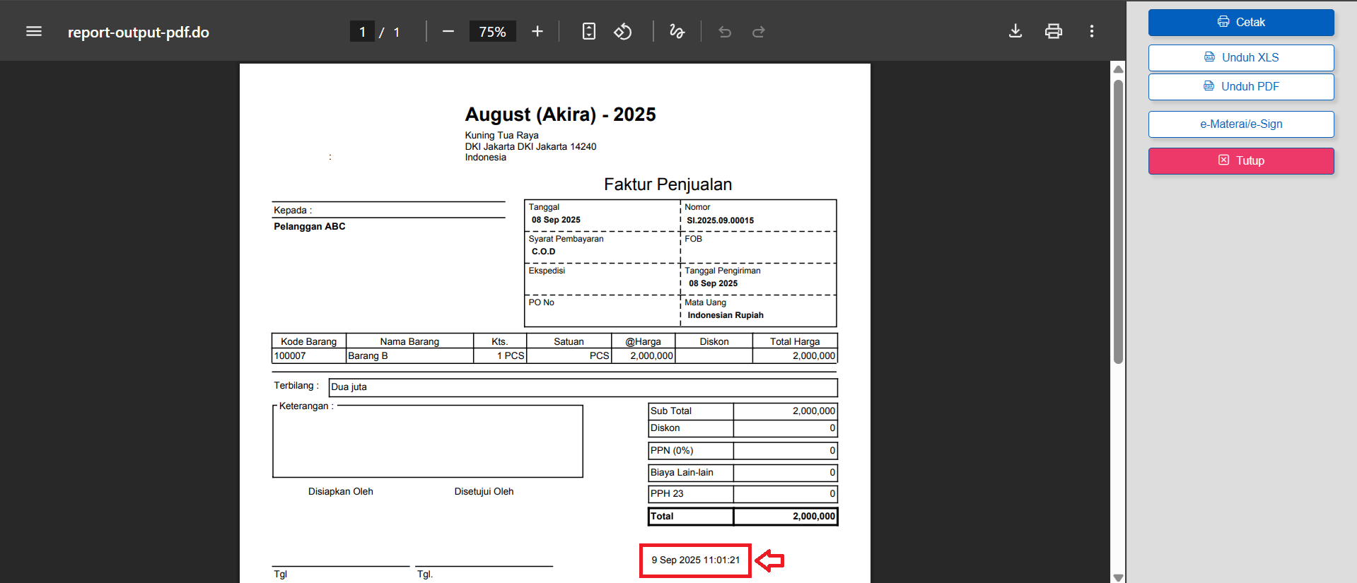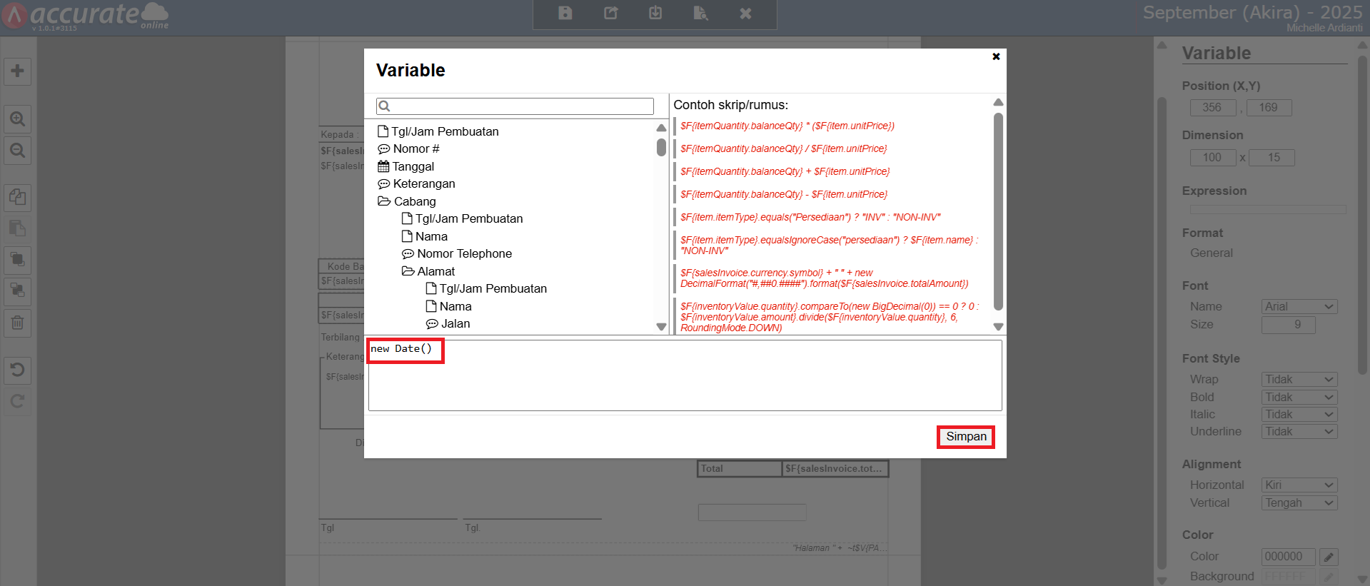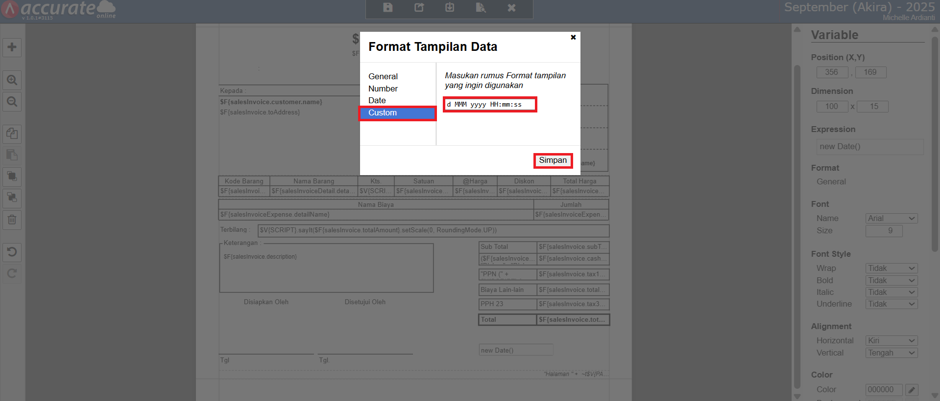 Berikut langkah-langkah menampilkan Tanggal & Waktu Cetak Transaksi pada desain cetakan di Accurate Online (misal, Faktur Penjualan):