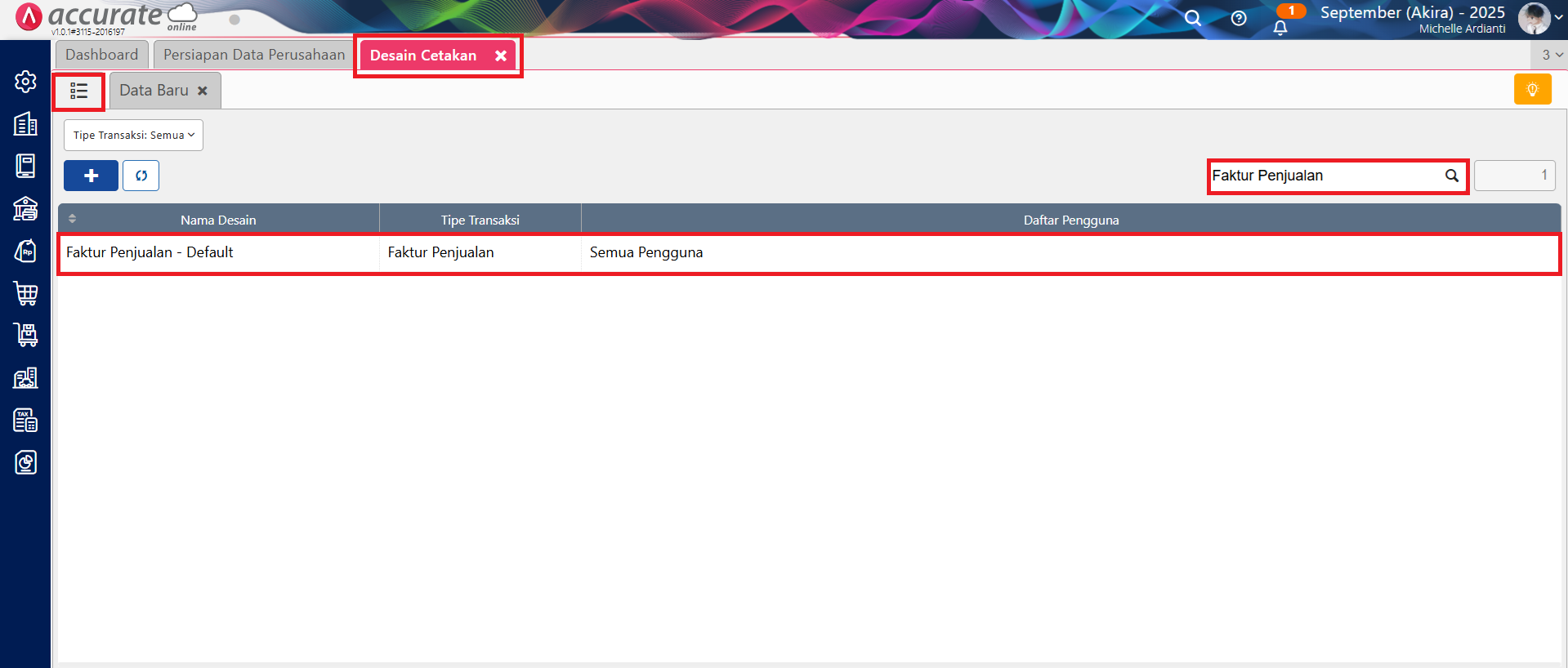 - Ke menu Pengaturan | Desain Cetakan, lalu klik tombol Daftar berwarna hijau di samping tab Data Baru, dan lakukan pencarian atas desain cetakan Faktur Penjualan yang dimaksud.