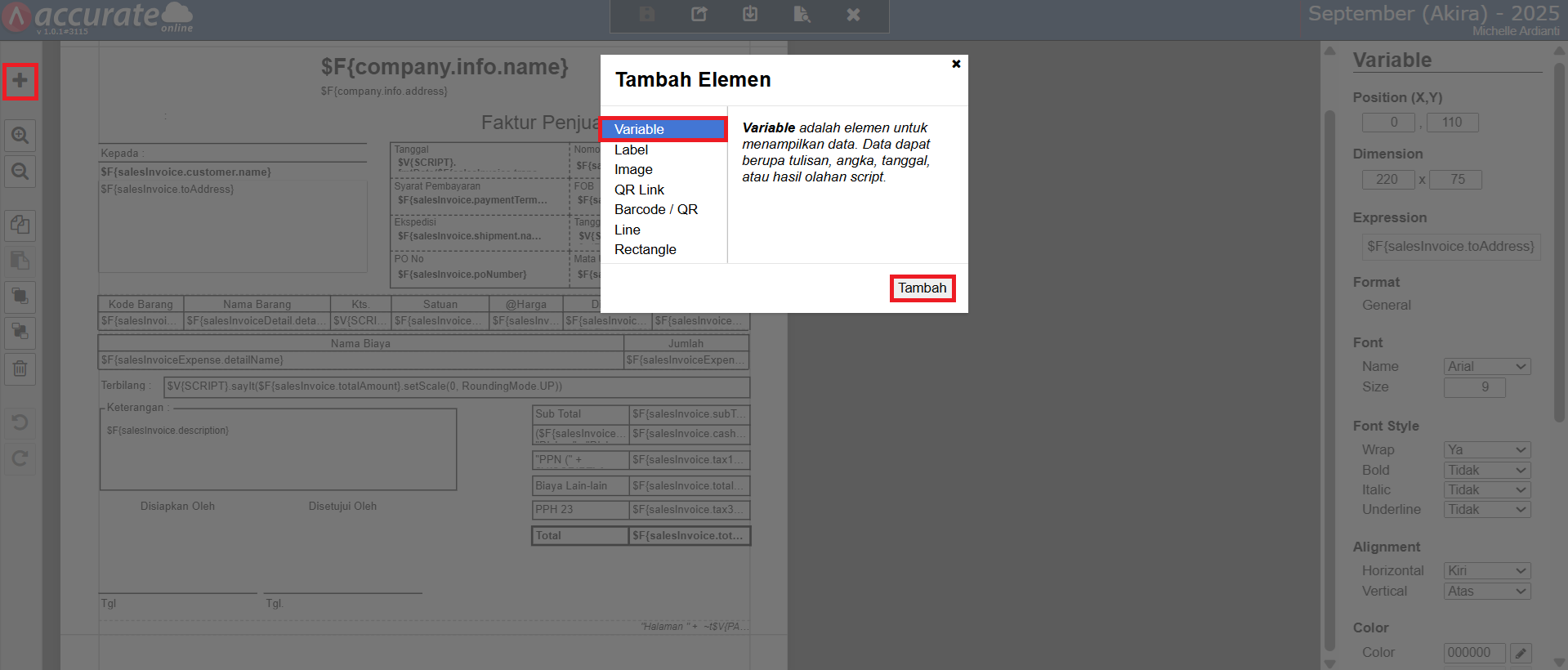 - Selanjutnya, klik tombol Tambah Element (icon +) | Variable, klik Tambah dan posisikan kolom Variable tersebut sesuai dengan yang diinginkan.
