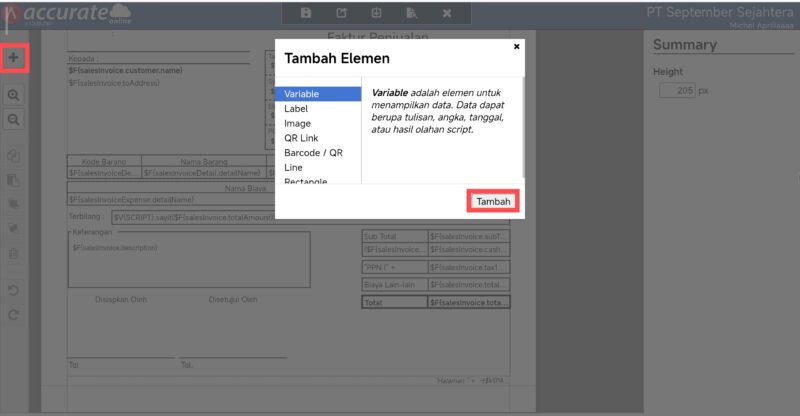 2. Selanjutnya klik (+) | Variable, lalu klik Tambah kemudian letakkan variable yang baru ditambahkan tersebut pada posisi yang diinginkan atau sesuai dengan kebutuhan anda.