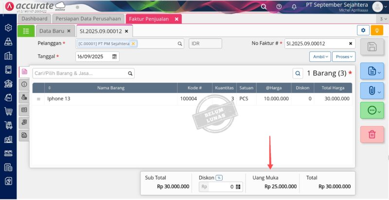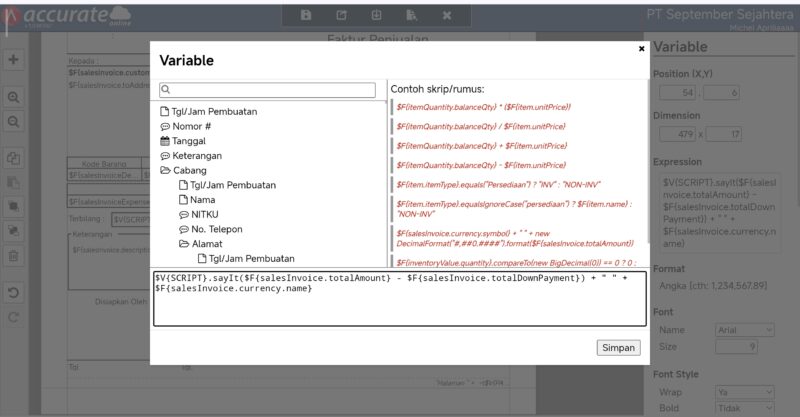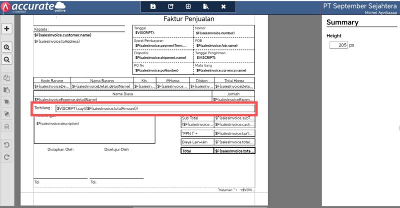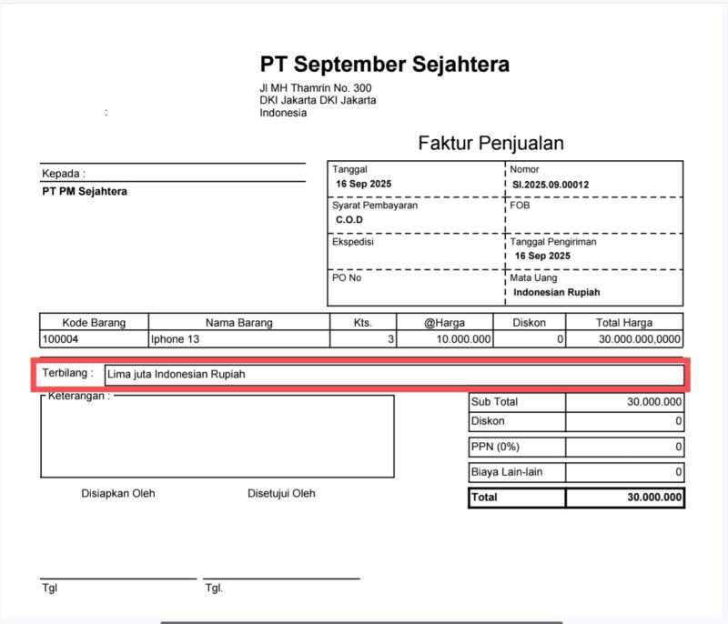 Berikut langkah-langkah untuk menampilkan informasi Terbilang (Say) yang sudah dipotong dengan Uang Muka (Down Payment) pada Desain Cetakan Faktur Penjualan :