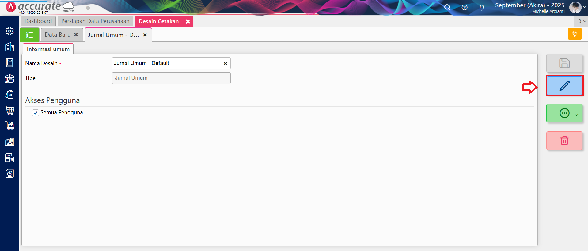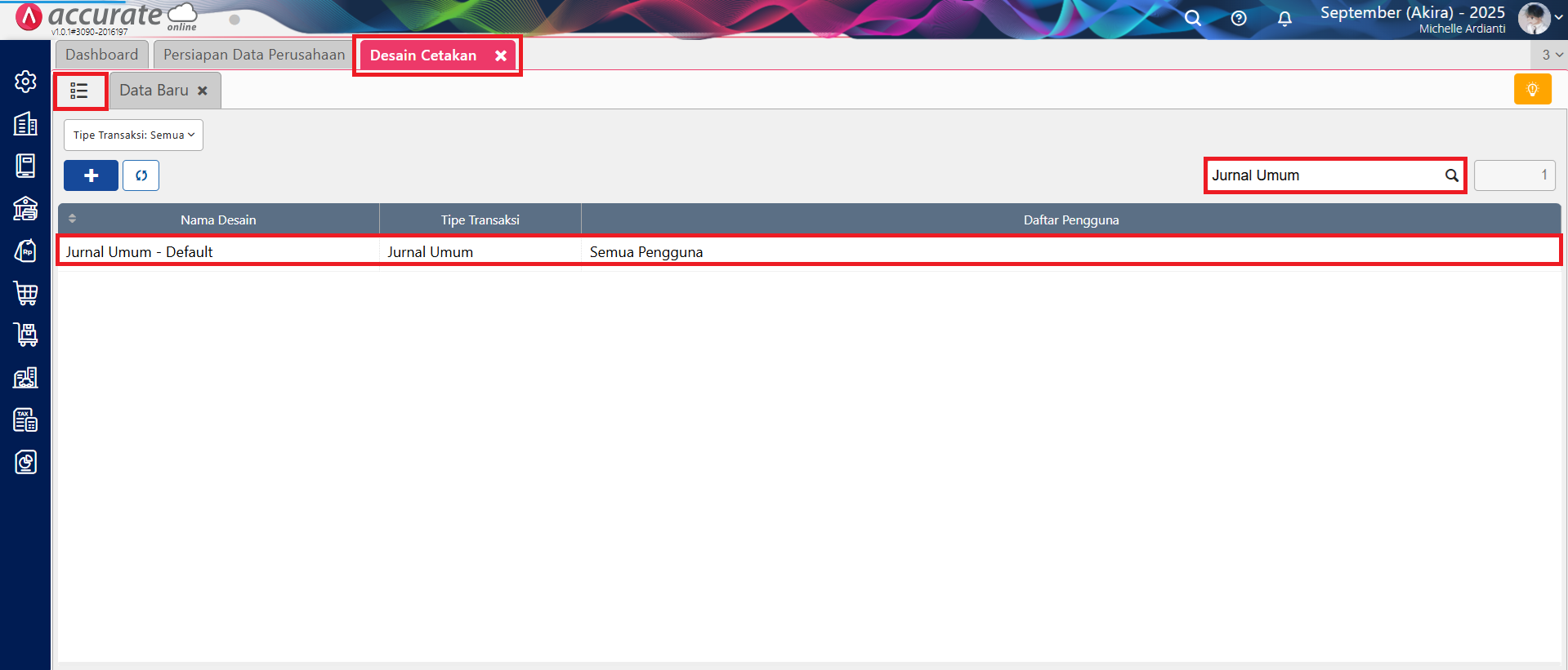 - Pilih Desain Cetakan Jurnal Umum yang dimaksud, kemudian klik Buka Desainer.