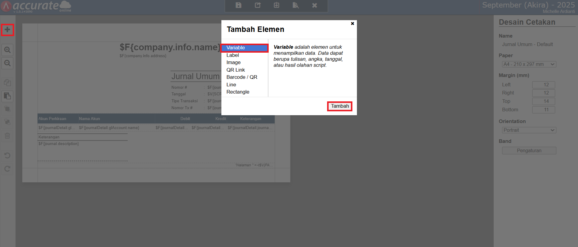 - Pada Desainer klik (+), pilih Variable dan klik Tambah.
