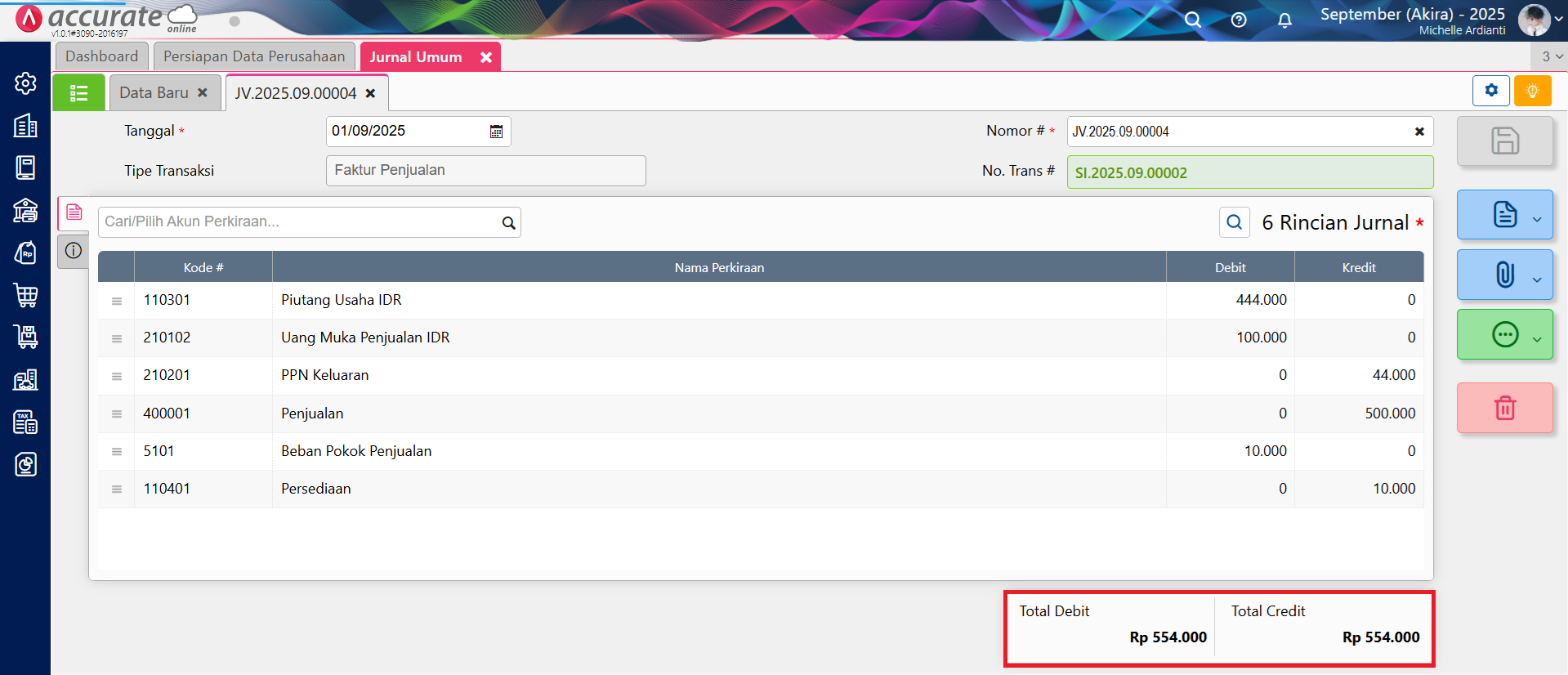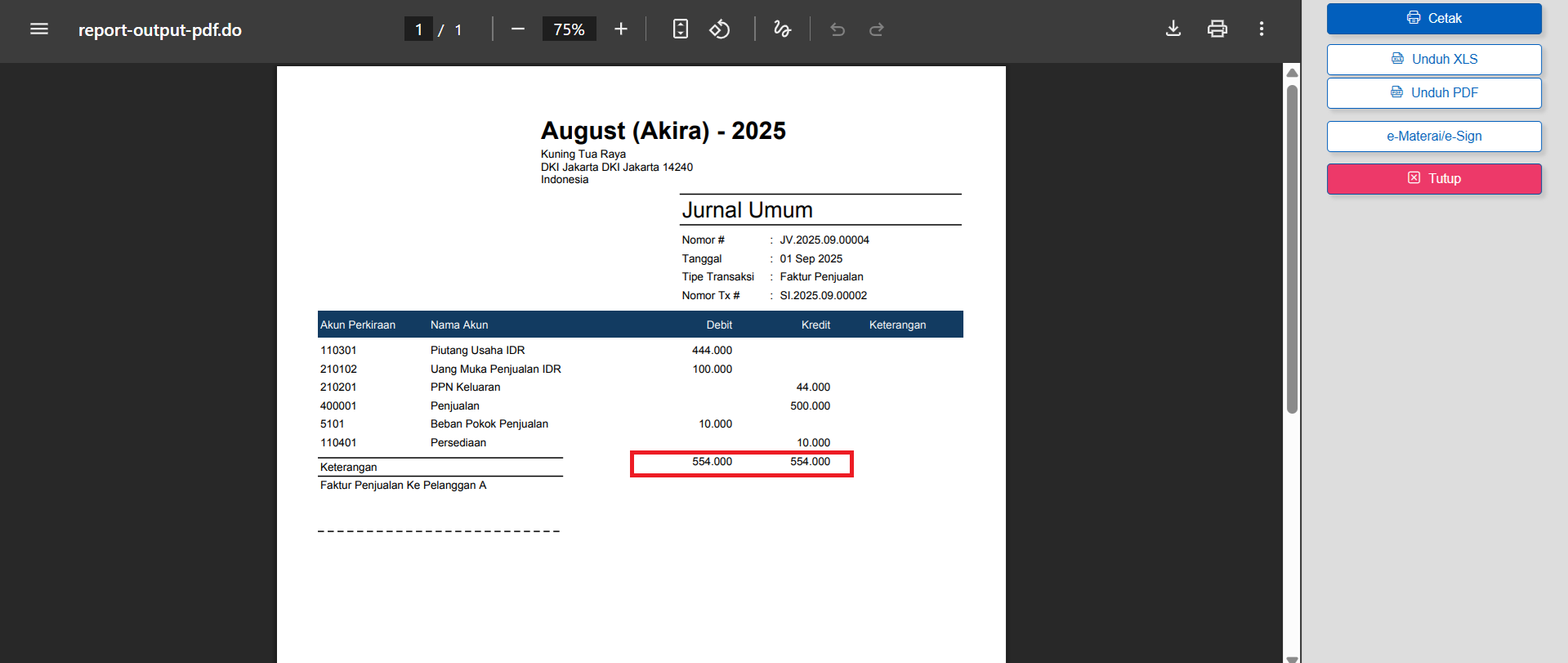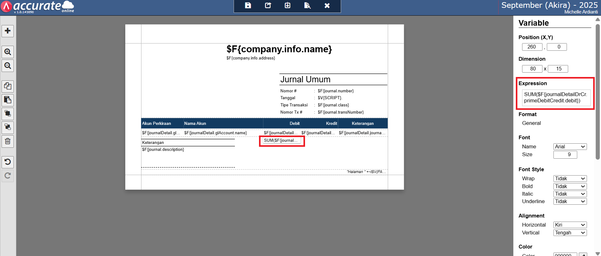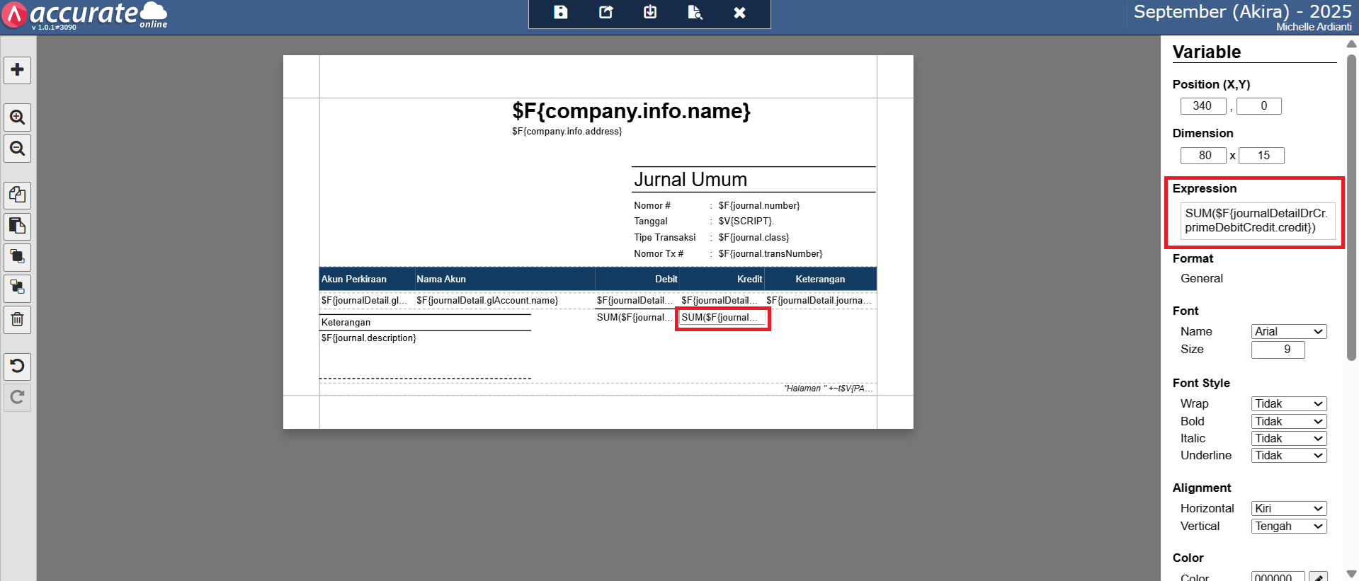 Berikut panduan Menampilkan Total Nilai Debit & Credit pada Desain Cetakan Jurnal Umum :