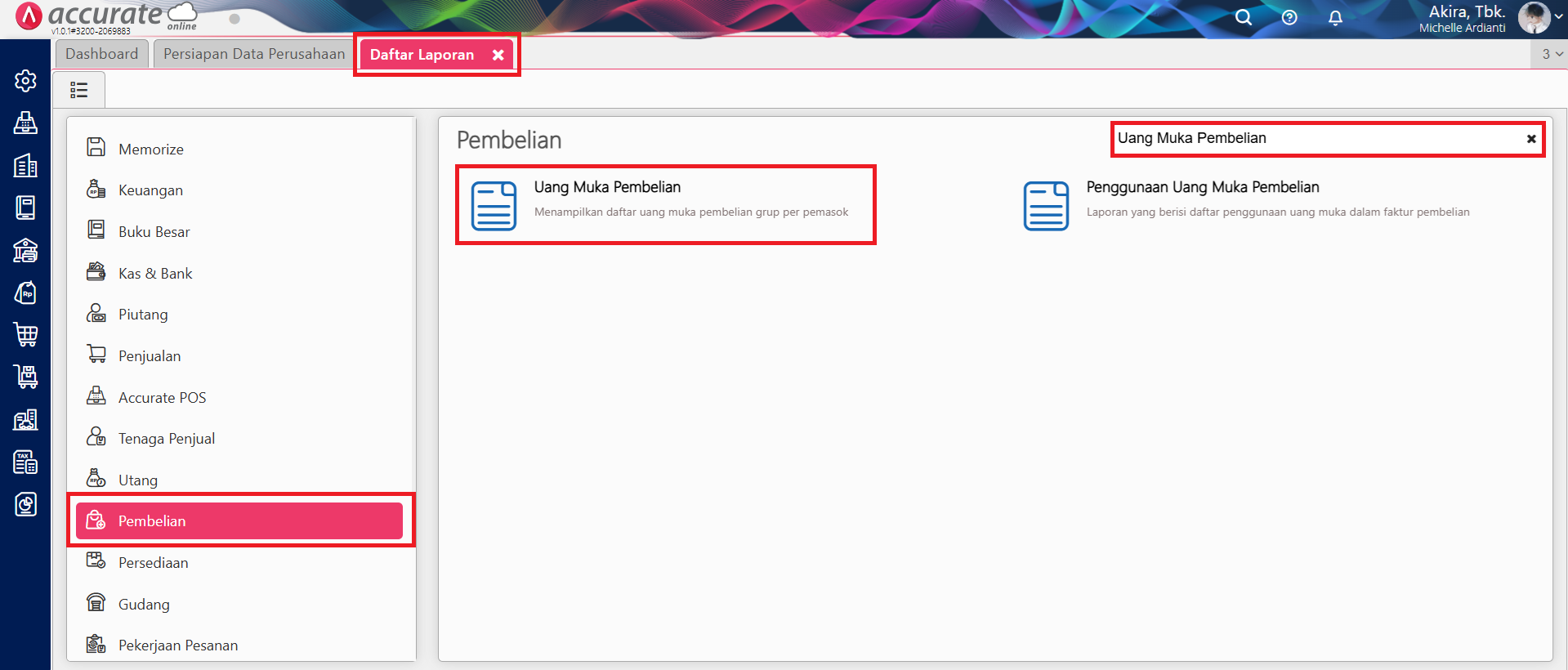 Lakukan pencarian atas laporan ‘Uang Muka Pembelian’