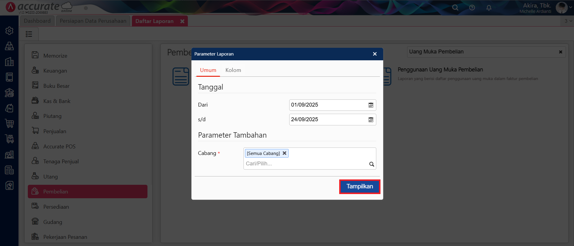 Atur parameter laporan seperti Tanggal dan Cabang