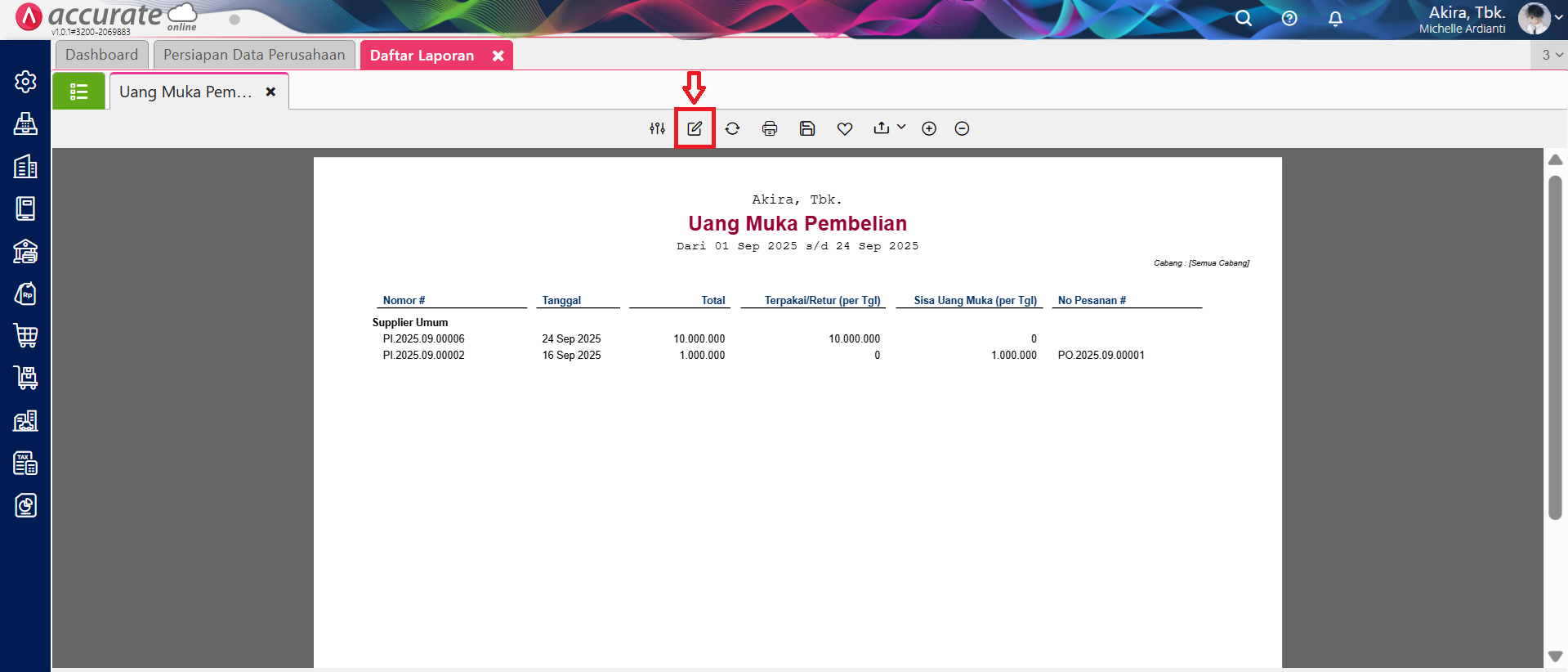 - Berikut tampilan laporan Uang Muka Pembelian yang menampilkan Uang Muka Pembelian yang belum digunakan.