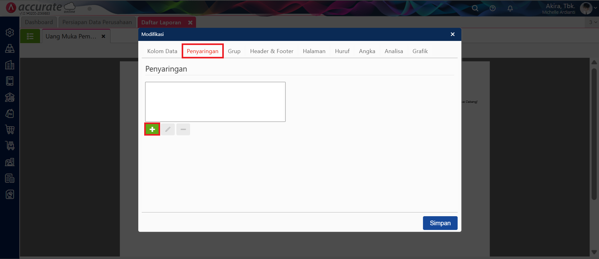 - Pada laporan Uang Muka Pembelian, klik Modifikasi untuk melakukan perubahan pada laporannya. Lalu ke tab Penyaringan, kemudian klik tombol Tambah (icon +).
